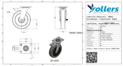Lenkrolle Edelstahl, 200mm Durchmesser, Elastischer Gummi Lauffläche, Kugellager Edelstahl, Totalfeststeller, Nachlauf