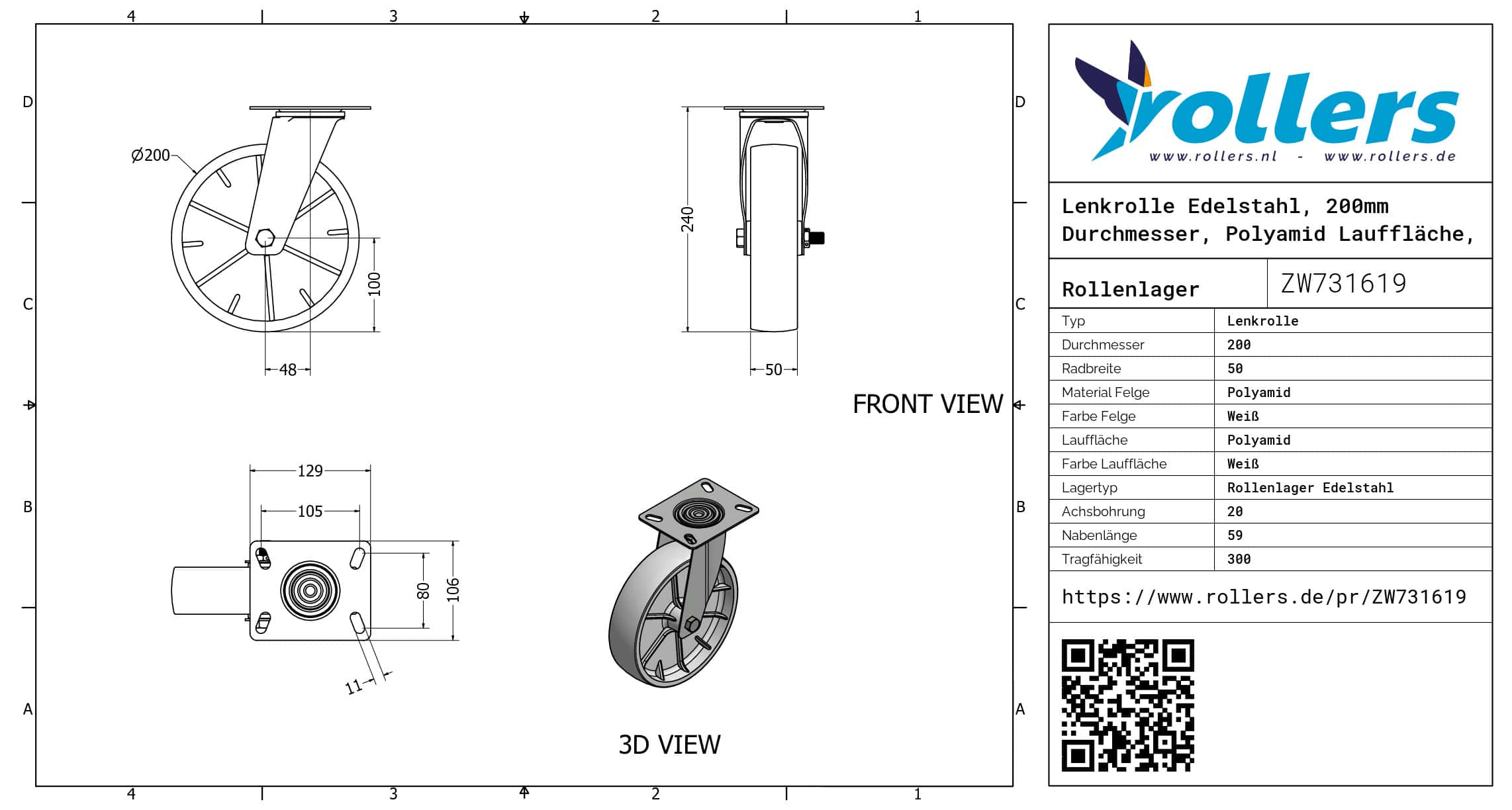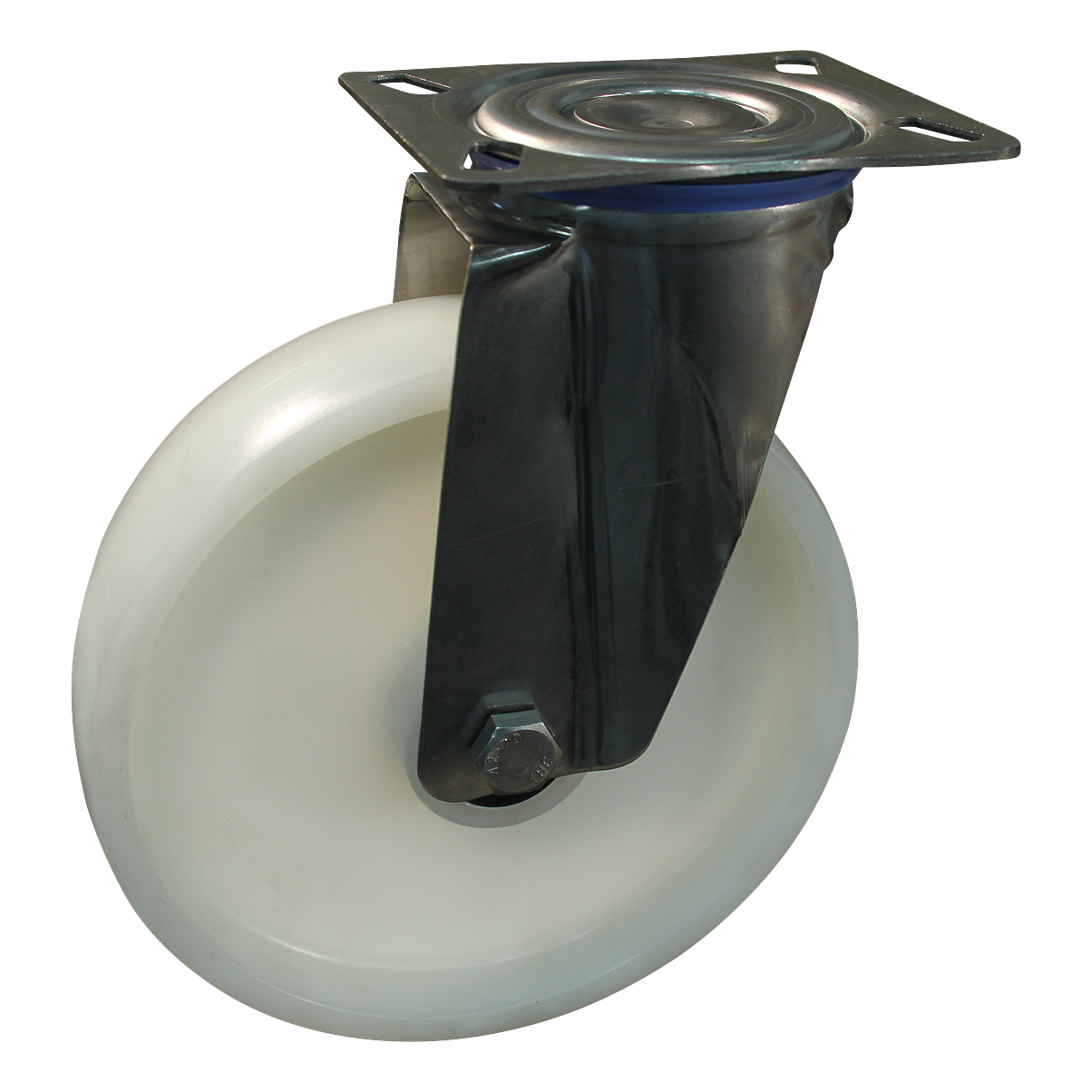Diese Lenkrolle hat eine Gabel aus Edelstahl. Dies kann mit Befestigingsart „Platte“ befestigt werden. Die Rolle hat eine Bauhöhe von 240 millimeter. Das Material der Felge ist Polyamid (weiß ist die Farbe) und der Lauffläche Polyamid (Farbe weiß). Das Rad hat einen Durchmesser von 200 millimeter und eine Breite von 50 millimeter. Die Nabenlänge beträgt 59 millimeter mit einem Achsloch von 20 millimeter. Die Tragfähigkeit beträgt 300 kg. Der Lagertyp: Rollenlager Edelstahl. Dieses Produkt ist in unserem Shop in folgenden Kategorien erhältlich: Lenkrolle Edelstahl, Lenkrollen 300 kg, Schwerlastrollen, Lenkrollen 200 mm, Transportrollen, Nylon Rollen, Nylon Rollen mit Lager, Lenkrollen ohne Bremse, Schwerlastlenkrollen, Lenkrollen.