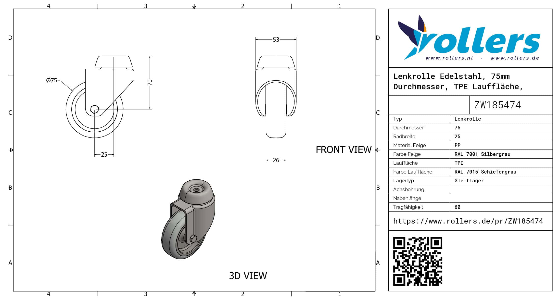 Dies ist eine Lenkrolle mit einem Gabel aus Edelstahl. Weise der Befestigung: Bolzenloch. Die Bauhöhe ist 106 mm. Die Felge besteht aus PP (Farbe RAL 7001 Silbergrau) und die Lauffläche aus TPE (RAL 7015 Schiefergrau). Das Rad hat einen Durchmesser von 75 mm und eine Breite von 25 mm. Die Tragfähigkeit beträgt 60 kg. Der Lagertyp: Gleitlager. Marke: Novio.