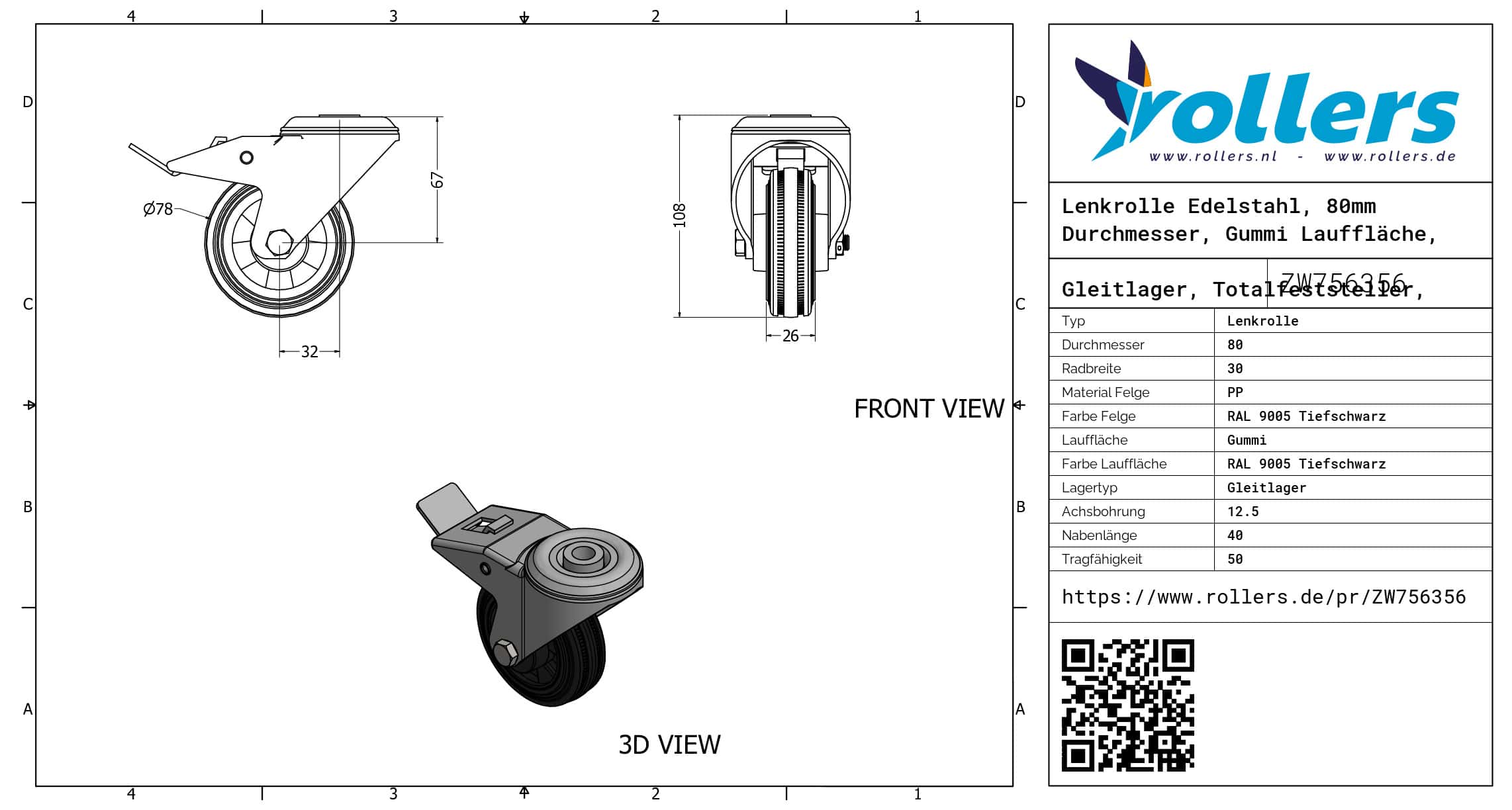 Lenkrolle Edelstahl, 80mm Durchmesser, Gummi Lauffläche, Gleitlager, Totalfeststeller, Nachlauf