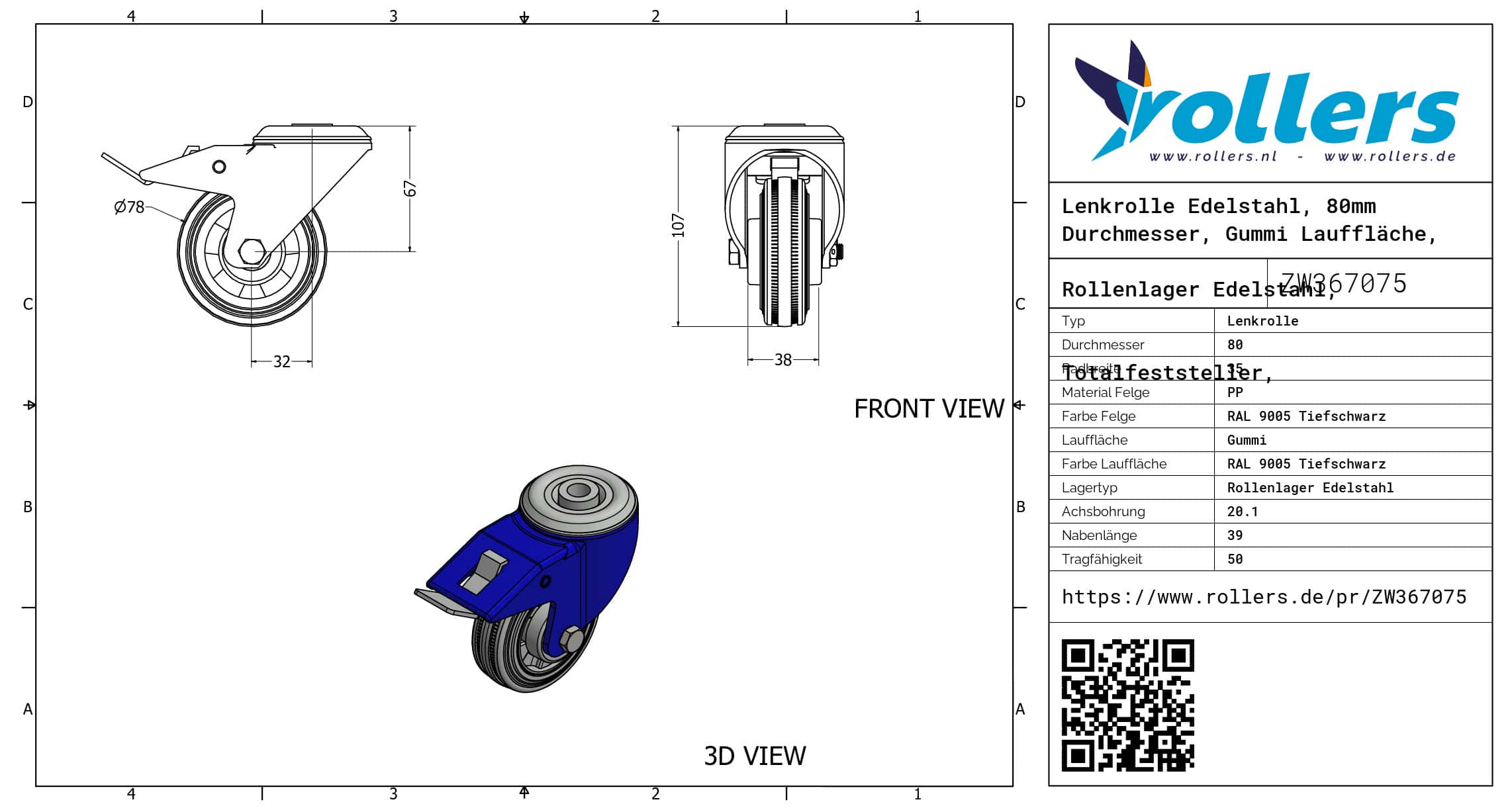 Dies ist eine Lenkrolle aus Edelstahl. Diese Rolle hat eine Totalfeststeller, Nachlauf. Dies kann mit Befestigingsart „Bolzenloch“ befestigt werden. Die Bauhöhe beträgt 108 mm. Das Material der Felge ist PP (Farbe RAL 9005 Tiefschwarz) und der Lauffläche Gummi (RAL 9005 Tiefschwarz ist die Farbe). Das Rad hat einen Durchmesser von 80 mm und eine Breite von 35 mm. Die Nabenlänge beträgt 39 mm mit einem Achsloch von 20.1 mm. Die Lenkrolle hat eine Tragfähigkeit von 50 kilo. Der Lagertyp: Rollenlager Edelstahl. Rollers.de hat dieses Produkt in die folgenden Kategorien eingeteilt: Gummiräder, Kleine Lenkrollen mit Feststeller, Kleine Lenkrollen, Lenkrolle Edelstahl, Lenkrollen 50 kg, Lenkrollen 80 mm, Gummi Lenkrollen, Transportrollen, Lenkrollen mit Bremse, Lenkrollen.