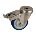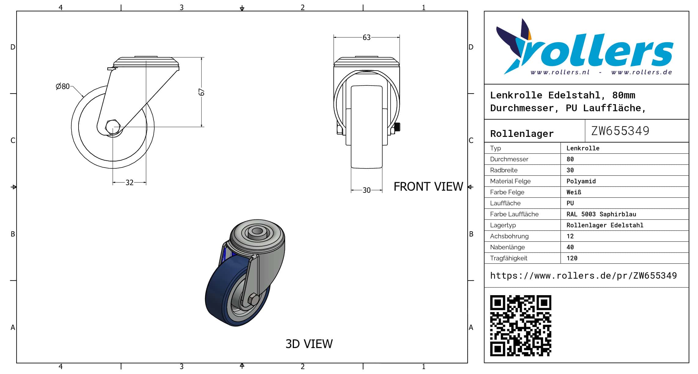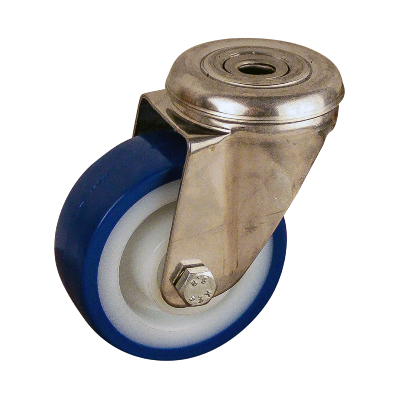 Dies ist eine Lenkrolle mit einem Gabel aus Edelstahl. Weise der Befestigung: Bolzenloch. Die Bauhöhe beträgt 108 mm. Das Material der Felge ist Polyamid (Farbe weiß) und der Lauffläche PU (Farbe RAL 5003 Saphirblau). Das Rad hat einen Durchmesser von 80 mm und eine Breite von 30 mm. Die Nabenlänge beträgt 40 mm und die Achsbohrung hat einen Durchmesser von 12 mm. Die Tragfähigkeit beträgt 120 kg. Das Rad hat ein Rollenlager Edelstahl als Lagerung. Dieses Produkt finden Sie in unseren Kategorien: Kleine Lenkrollen, Lenkrolle Edelstahl, Lenkrollen 80 mm, PU Rollen, Polyurethan Rollen, Lenkrollen 100 kg, Transportrollen, Lenkrollen ohne Bremse, Lenkrollen.