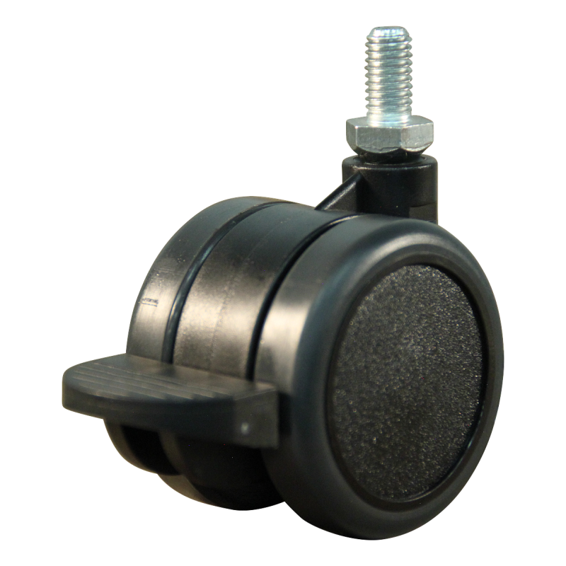 Dies ist eine Lenkrolle mit einem Gabel aus Kunststoff. Die Bremse ist vom Typ: Radbremse. Weise der Befestigung: Gewindestift. Die Bauhöhe ist 81 millimeter. Das Material der Felge ist Polyamid (schwarz ist die Farbe) und der Lauffläche PU (Grau ist die Farbe). Das Rad hat einen Durchmesser von 50 millimeter und eine Breite von 43 millimeter. Die Rolle hat eine Tragfähigkeit von 50 kilo. Das Rad hat ein Gleitlager als Lagerung. Marke: Novio.
