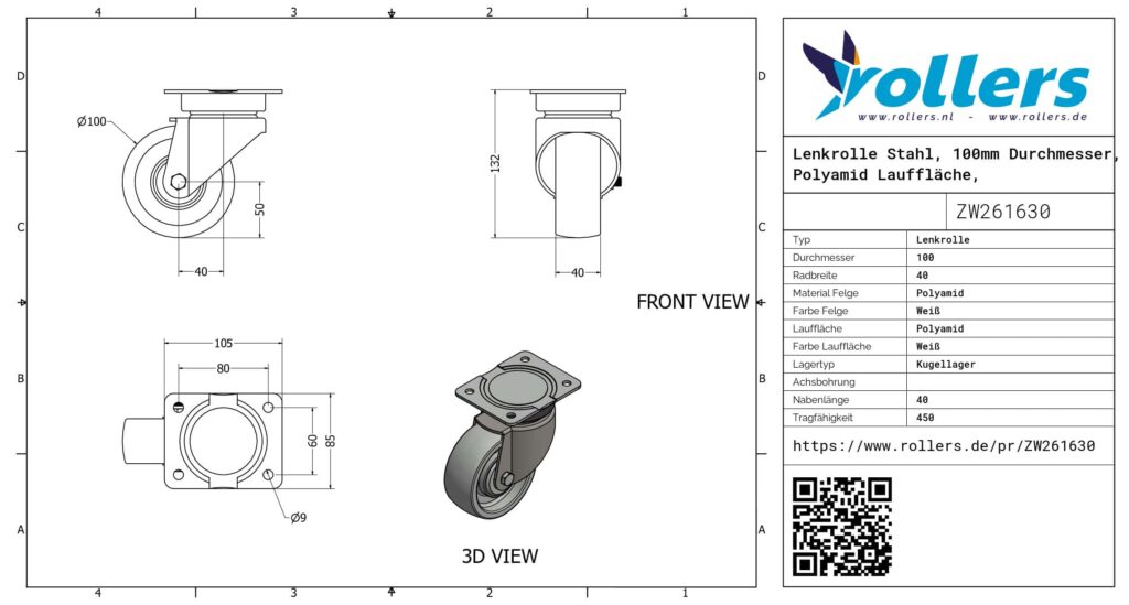 Diese Lenkrolle hat eine Gabel aus Stahl. Die Lenkrolle hat die folgende Befestigungsart: Platte. Die Bauhöhe beträgt 132 millimeter. Das Rad besteht vollständig aus Polyamid (weiß). Das Rad hat einen Durchmesser von 100 millimeter und eine Breite von 40 millimeter. Die Tragfähigkeit beträgt 450 kilo. Das Rad hat ein Kugellager als Lagerung. Dieses Produkt finden Sie in unseren Kategorien: Schwerlastlenkrollen mit Axiallager, Lenkrollen 300 kg, Schwerlastrollen, Lenkrollen 100 mm, Transportrollen, Nylon Rollen, Nylon Rollen mit Lager, Lenkrollen ohne Bremse, Schwerlastlenkrollen, Lenkrollen.