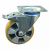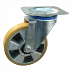 Dies ist eine Lenkrolle mit einem Gabel aus Stahl. Die Bremse ist vom Typ: Totalfeststeller, Nachlauf. Dies kann mit Befestigingsart „Platte“ befestigt werden. Die Bauhöhe beträgt 128 millimeter. Das Material der Felge ist Aluminium und der Lauffläche PU (RAL 1005 Honiggelb ist die Farbe). Das Rad hat einen Durchmesser von 100 millimeter und eine Breite von 30 millimeter. Die Nabenlänge beträgt 40 millimeter und die Achsbohrung hat einen Durchmesser von 15 millimeter. Die Tragfähigkeit beträgt 180 kilogram. Das Rad hat ein Kugellager als Lagerung.