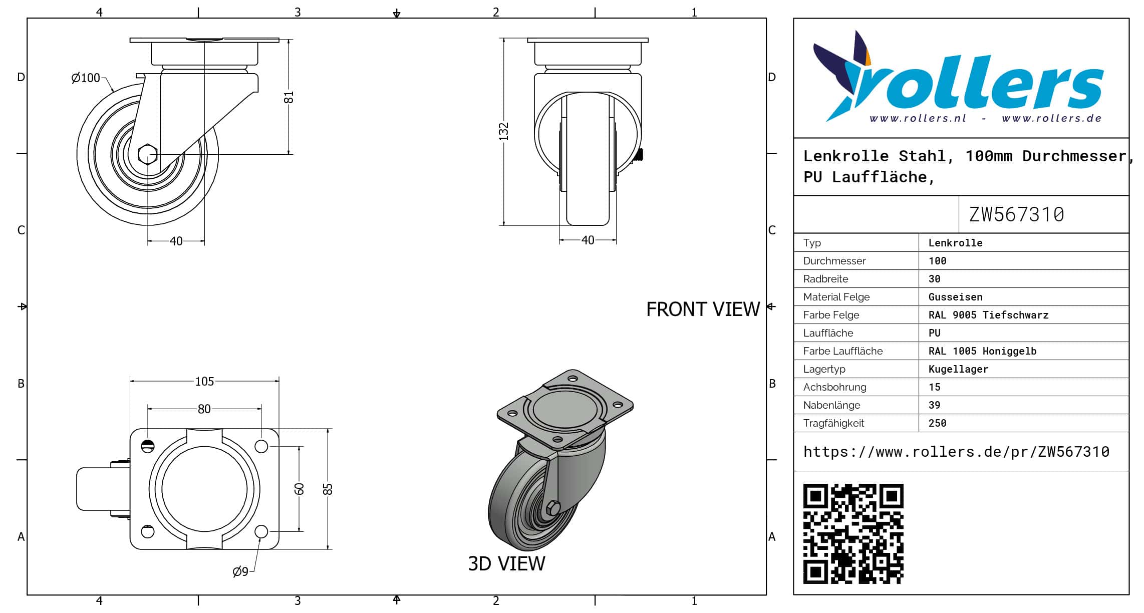 Diese Lenkrolle hat eine Gabel aus Stahl. Dies kann mit Befestigingsart „Platte“ befestigt werden. Die Bauhöhe beträgt 110 millimeter. Das Material der Felge ist Gusseisen (RAL 9005 Tiefschwarz ist die Farbe) und der Lauffläche PU (Farbe RAL 1005 Honiggelb). Das Rad hat einen Durchmesser von 100 millimeter und eine Breite von 30 millimeter. Die Nabenlänge beträgt 39 millimeter mit einem Achsloch von 15 millimeter. Das Rad hat eine Tragfähigkeit von 250 kg. Das Rad hat ein Kugellager als Lagerung. Dieses Produkt finden Sie in unseren Kategorien: Rollbehälter Rollen, Müllcontainer Rollen, Schwerlastlenkrollen mit Axiallager, Lenkrollen 200 kg, PU Rollen, Polyurethan Rollen, Lenkrollen 100 mm, Transportrollen, Lenkrollen ohne Bremse, Lenkrollen.