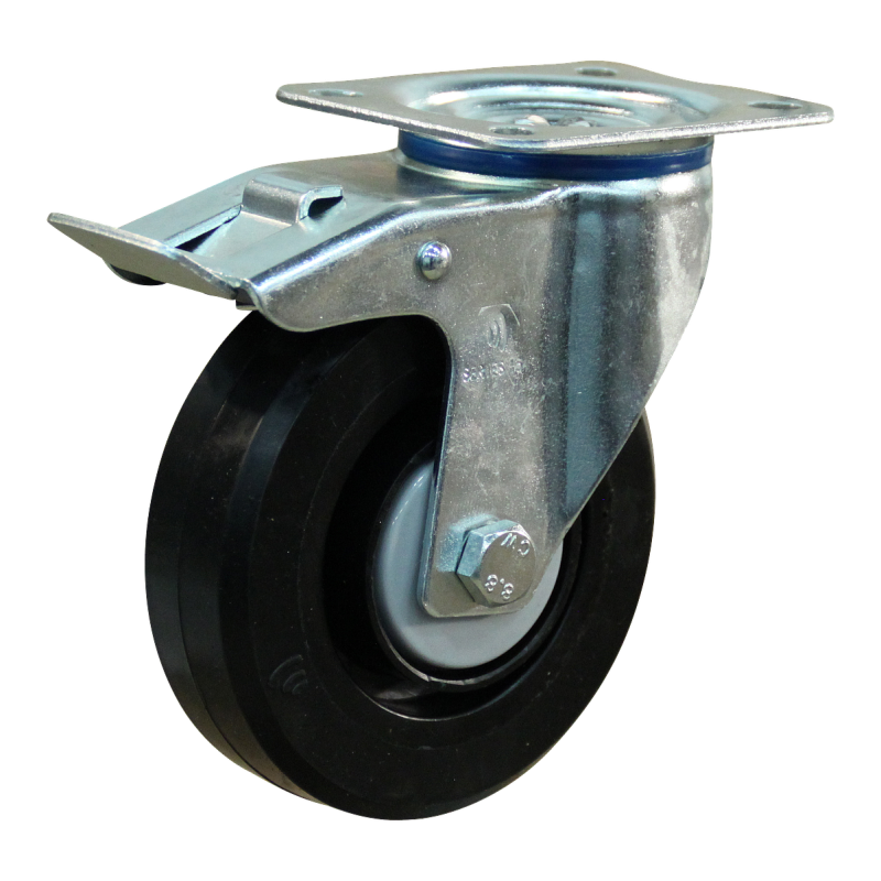 Lenkrolle Stahl, 125mm Durchmesser, Elastischer Gummi Lauffläche, Kugellager, Totalfeststeller, Nachlauf
