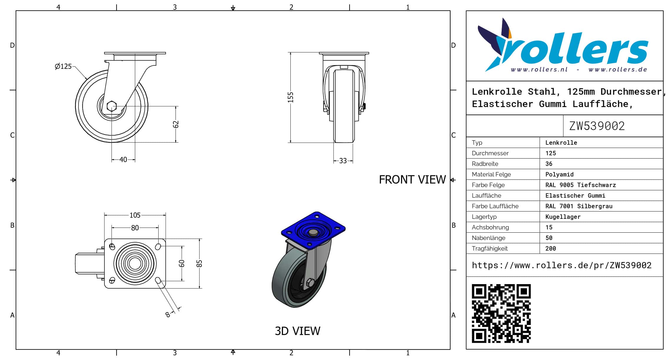 Diese Lenkrolle hat eine Gabel aus Stahl. Dies kann mit Befestigingsart „Platte“ befestigt werden. Die Bauhöhe beträgt 154 millimeter. Das Material der Felge ist Polyamid (RAL 9005 Tiefschwarz ist die Farbe) und der Lauffläche Elastischer Gummi (RAL 7001 Silbergrau ist die Farbe). Das Rad hat einen Durchmesser von 125 millimeter und eine Breite von 36 millimeter. Die Nabenlänge beträgt 50 millimeter mit einem Achsloch von 15 millimeter. Die Tragfähigkeit beträgt 200 kg. Das Rad hat ein Kugellager als Lagerung. Dieses Produkt finden Sie in unseren Kategorien: Gummiräder, Rollbehälter Rollen, Müllcontainer Rollen, Lenkrollen 200 kg, Lenkrollen 125 mm, Gummi Lenkrollen, Transportrollen, Lenkrollen ohne Bremse, Lenkrollen.