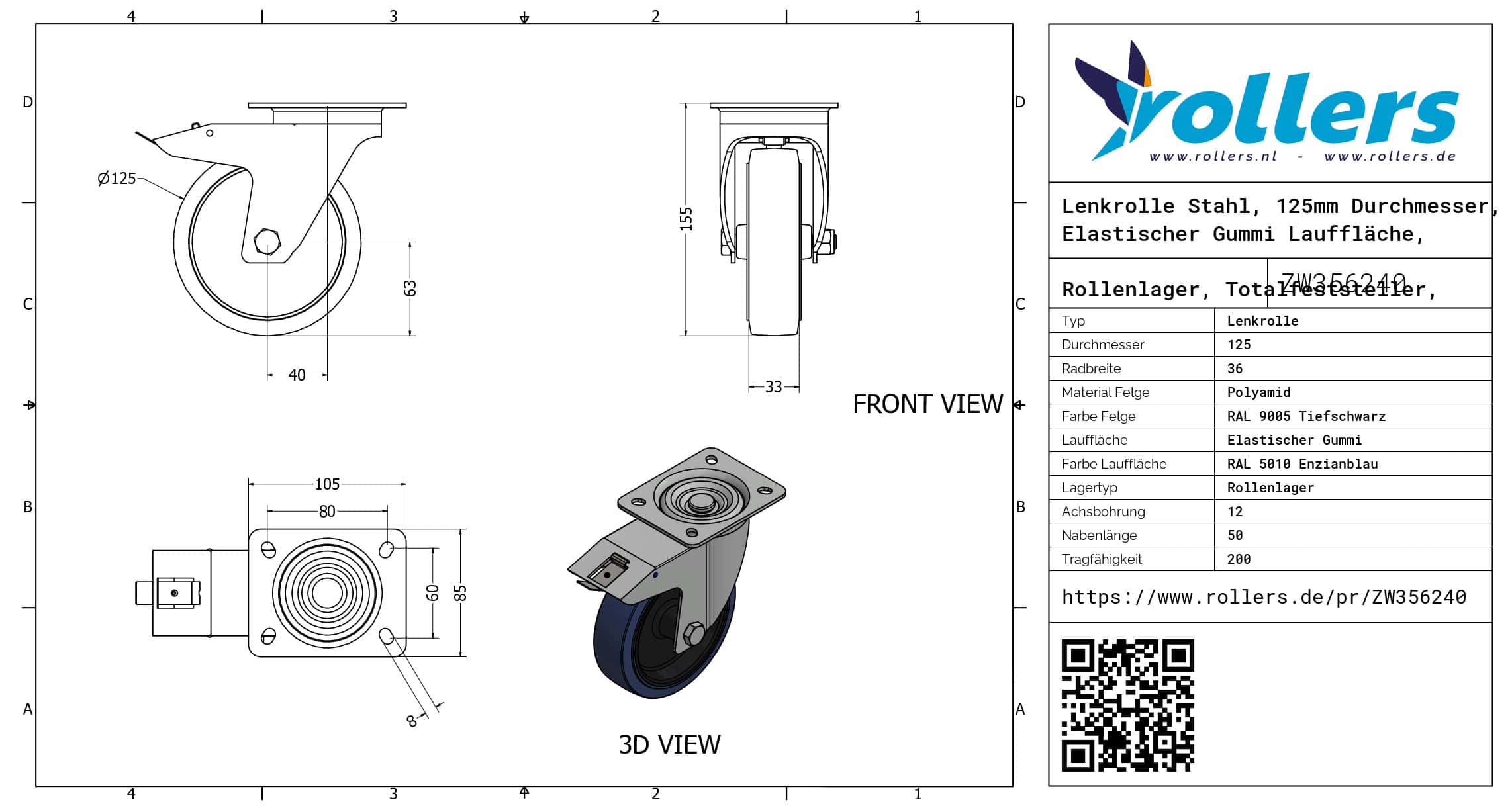 Dies ist eine Lenkrolle aus Stahl. Die Bremse ist vom Typ: Totalfeststeller, Nachlauf. Dies kann mit Befestigingsart „Platte“ befestigt werden. Die Rolle hat eine Bauhöhe von 154 millimeter. Das Material der Felge ist Polyamid (RAL 9005 Tiefschwarz) und der Lauffläche Elastischer Gummi (RAL 5010 Enzianblau). Das Rad hat einen Durchmesser von 125 millimeter und eine Breite von 36 millimeter. Die Nabenlänge beträgt 50 millimeter und die Achsbohrung hat einen Durchmesser von 12 millimeter. Die Lenkrolle hat eine Tragfähigkeit von 200 kg. Das Rad hat ein Rollenlager als Lagerung. Rollers.de hat dieses Produkt in die folgenden Kategorien eingeteilt: Flightcase-Räder, Gummiräder, Rollbehälter Rollen, Müllcontainer Rollen, Lenkrollen 200 kg, Lenkrollen 125 mm, Gummi Lenkrollen, Transportrollen, Lenkrollen mit Bremse, Lenkrollen.