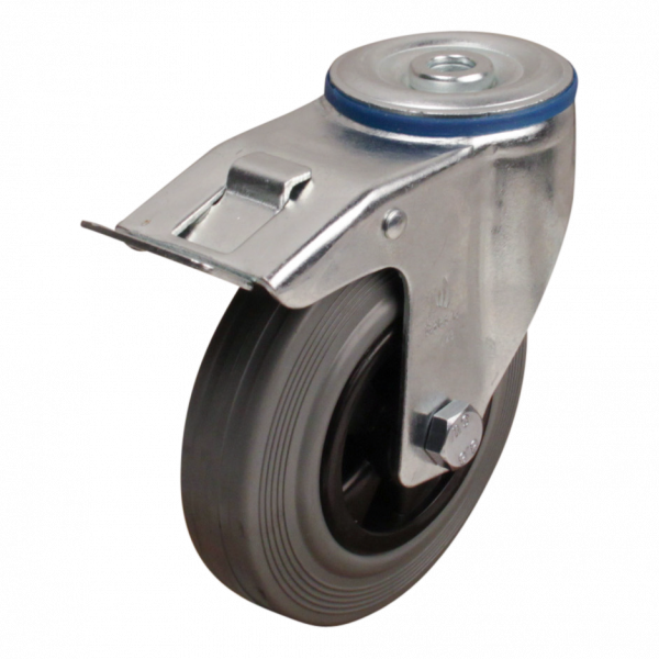 Dies ist eine Lenkrolle aus Stahl. Diese Rolle hat eine Totalfeststeller, Nachlauf. Weise der Befestigung: Bolzenloch. Die Bauhöhe beträgt 152 millimeter. Die Felge besteht aus PP (Farbe RAL 9005 Tiefschwarz) und die Lauffläche aus Gummi (RAL 7001 Silbergrau ist die Farbe). Das Rad hat einen Durchmesser von 125 millimeter und eine Breite von 37 millimeter. Die Nabenlänge beträgt 48 millimeter und die Achsbohrung hat einen Durchmesser von 15 millimeter. Die Tragfähigkeit beträgt 100 kg. Das Rad hat ein Gleitlager als Lagerung. Dieses Produkt finden Sie in unseren Kategorien: Gummiräder, Lenkrollen 125 mm, Gummi Lenkrollen, Lenkrollen 100 kg, Transportrollen, Lenkrollen mit Bremse, Lenkrollen.