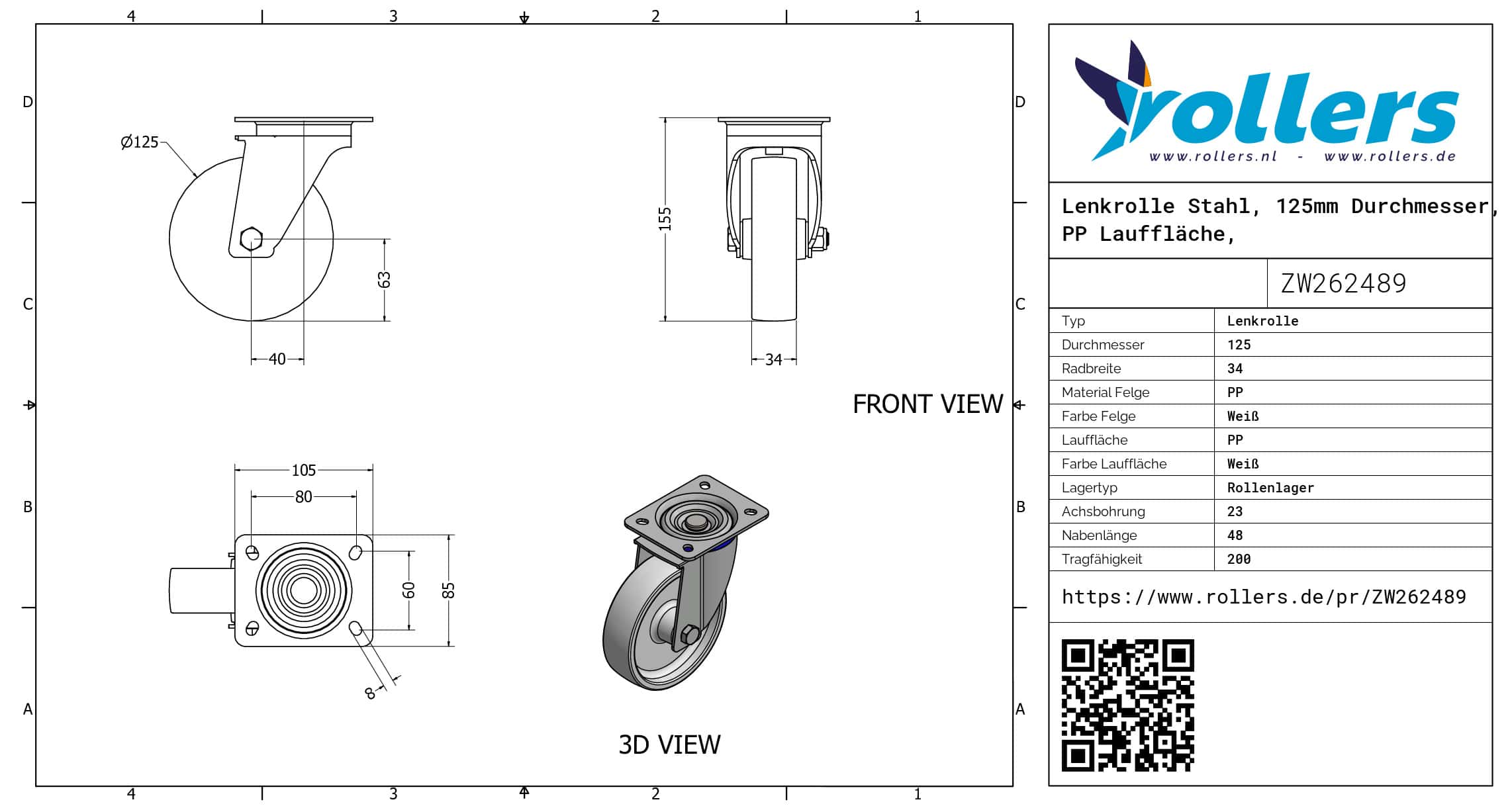 Diese Lenkrolle hat eine Gabel aus Stahl. Weise der Befestigung: Platte. Die Bauhöhe beträgt 154 mm. Die Felge besteht aus PP (weiß ist die Farbe) und die Lauffläche aus PP (weiß). Das Rad hat einen Durchmesser von 125 mm und eine Breite von 34 mm. Die Nabenlänge beträgt 48 mm und die Achsbohrung hat einen Durchmesser von 23 mm. Die Tragfähigkeit beträgt 200 kilo. Das Rad hat ein Rollenlager als Lagerung. Dieses Produkt finden Sie in unseren Kategorien: Lenkrollen 200 kg, Lenkrollen 125 mm, Transportrollen, Lenkrollen ohne Bremse, Lenkrollen.