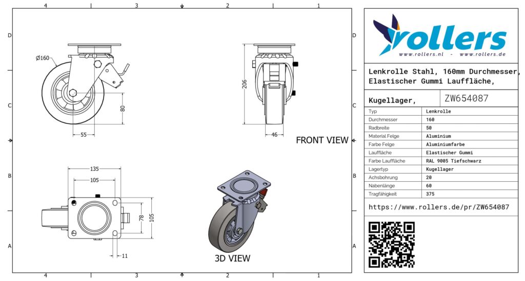 Dies ist eine Lenkrolle mit einem Gabel aus Stahl. Die Rolle hat eine Bremse des Typs Radbremse. Die Lenkrolle hat die folgende Befestigungsart: Platte. Die Bauhöhe ist 202 mm. Die Felge besteht aus Aluminium und die Lauffläche aus Elastischer Gummi (RAL 9005 Tiefschwarz ist die Farbe). Das Rad hat einen Durchmesser von 160 mm und eine Breite von 50 mm. Die Nabenlänge beträgt 60 mm mit einem Achsloch von 20 mm. Das Rad hat eine Tragfähigkeit von 375 kilo. Das Rad hat ein Kugellager als Lagerung. Dieses Produkt finden Sie in unseren Kategorien: Gummiräder, Rollbehälter Rollen, Müllcontainer Rollen, Schwerlastlenkrollen mit Axiallager, Lenkrollen 300 kg, Lenkrollen 160 mm, Schwerlastrollen, Gummi Lenkrollen, Transportrollen, Lenkrollen mit Bremse, Schwerlastlenkrollen, Lenkrollen.
