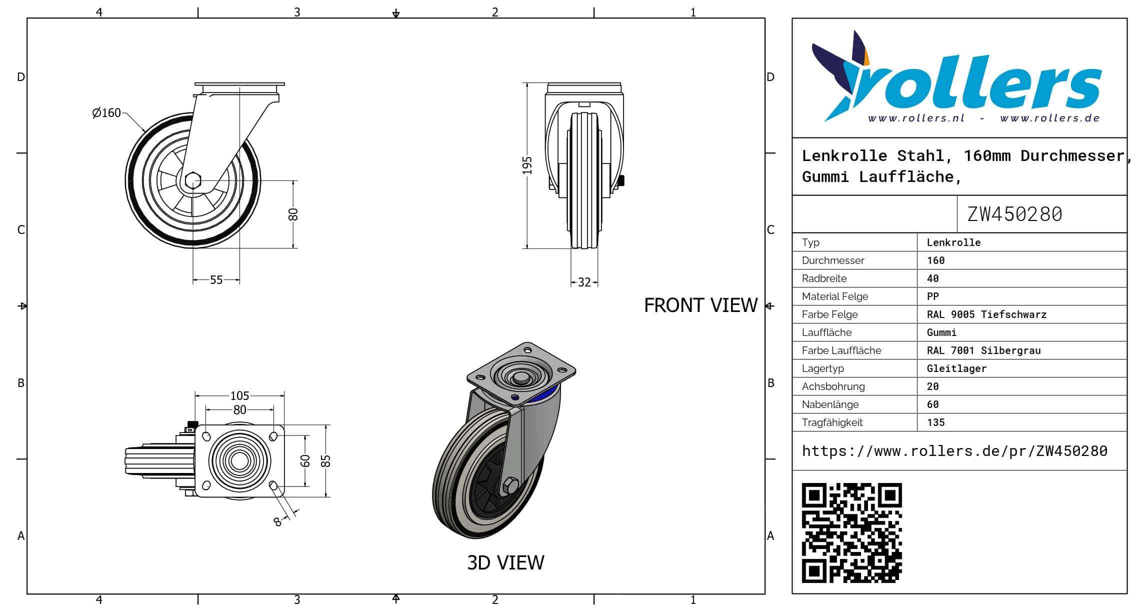 Dies ist eine Lenkrolle aus Stahl. Dies kann mit Befestigingsart „Platte“ befestigt werden. Die Bauhöhe beträgt 195 mm. Die Felge besteht aus PP (RAL 9005 Tiefschwarz) und die Lauffläche aus Gummi (RAL 7001 Silbergrau ist die Farbe). Das Rad hat einen Durchmesser von 160 mm und eine Breite von 40 mm. Die Nabenlänge beträgt 60 mm und die Achsbohrung hat einen Durchmesser von 20 mm. Die Tragfähigkeit beträgt 135 kilo. Der Lagertyp: Gleitlager. Dieses Produkt finden Sie in unseren Kategorien: Gummiräder, Rollbehälter Rollen, Müllcontainer Rollen, Lenkrollen 160 mm, Gummi Lenkrollen, Lenkrollen 100 kg, Transportrollen, Lenkrollen ohne Bremse, Lenkrollen.
