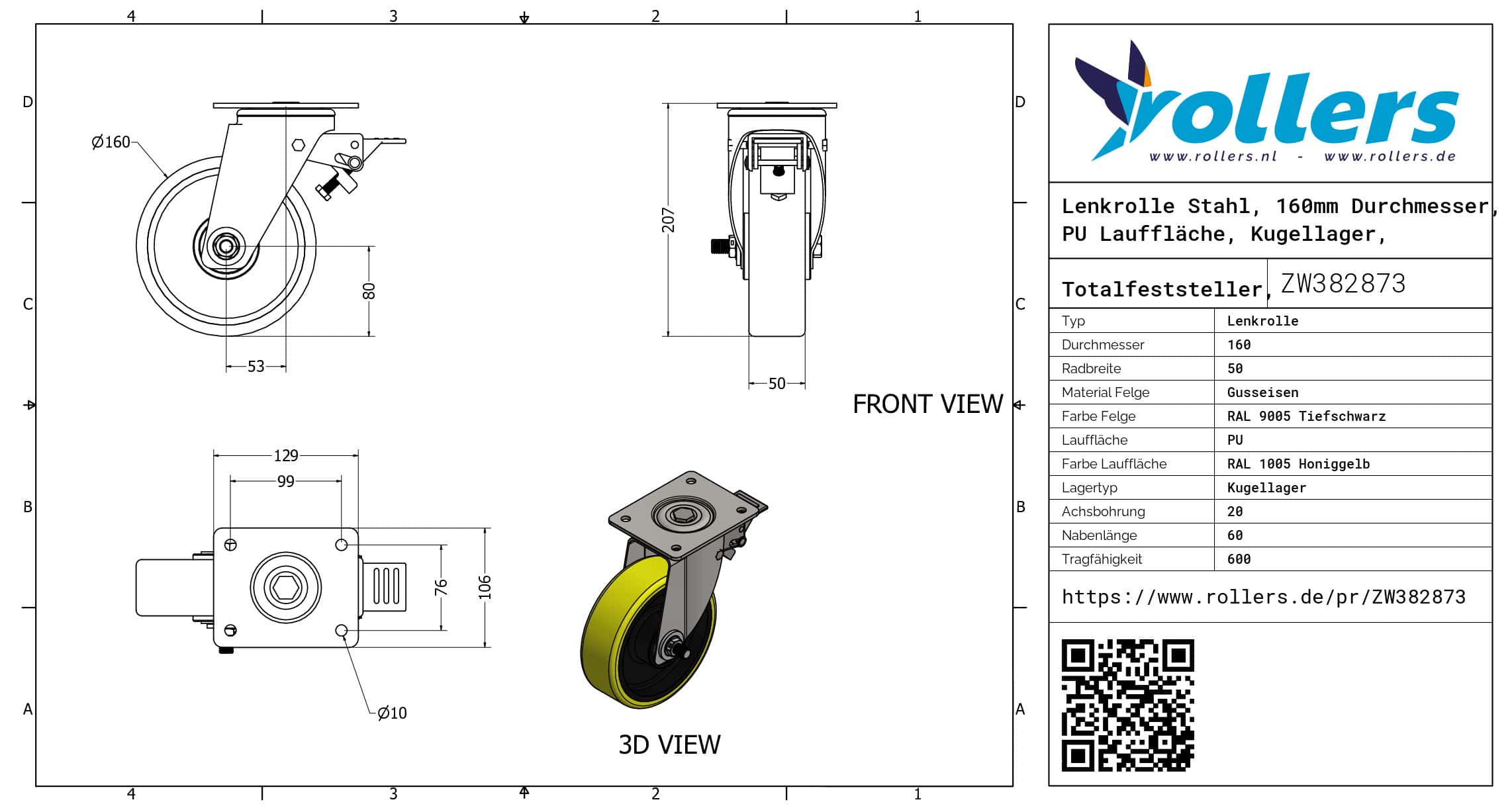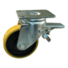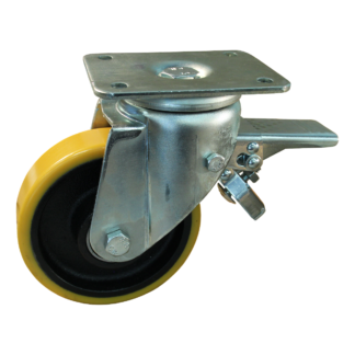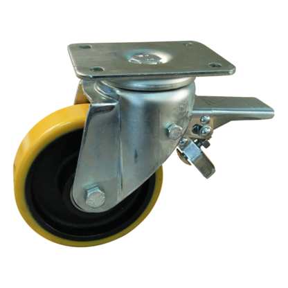Dies ist eine Lenkrolle aus Stahl. Die Bremse ist vom Typ: Totalfeststeller, Vorlauf. Dies kann mit Befestigingsart „Platte“ befestigt werden. Die Bauhöhe ist 207 millimeter. Die Felge besteht aus Gusseisen (Farbe RAL 9005 Tiefschwarz) und die Lauffläche aus PU (Farbe RAL 1005 Honiggelb). Das Rad hat einen Durchmesser von 160 millimeter und eine Breite von 50 millimeter. Die Nabenlänge beträgt 60 millimeter und die Achsbohrung hat einen Durchmesser von 20 millimeter. Die Lenkrolle hat eine Tragfähigkeit von 600 kg. Der Lagertyp: Kugellager. Dieses Produkt finden Sie in unseren Kategorien: Rollbehälter Rollen, Müllcontainer Rollen, Lenkrollen 500 kg, Lenkrollen 160 mm, Schwerlastrollen, PU Rollen, Polyurethan Rollen, Transportrollen, Lenkrollen mit Bremse, Schwerlastlenkrollen, Lenkrollen.
