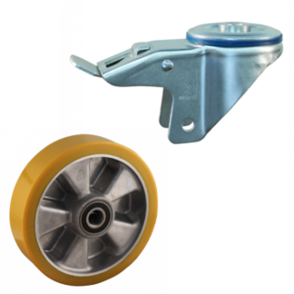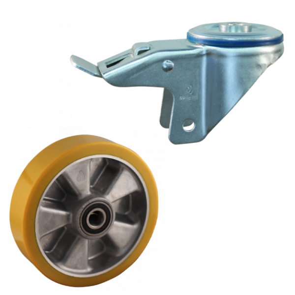 Dies ist eine Lenkrolle aus Stahl. Diese Rolle hat eine Totalfeststeller, Nachlauf. Die Lenkrolle hat die folgende Befestigungsart: Bolzenloch. Die Rolle hat eine Bauhöhe von 217 mm. Das Material der Felge ist Aluminium und der Lauffläche PU (RAL 1005 Honiggelb ist die Farbe). Das Rad hat einen Durchmesser von 175 mm und eine Breite von 50 mm. Die Lenkrolle hat eine Tragfähigkeit von 200 kilogram. Das Rad hat ein Kugellager als Lagerung. Dieses Produkt ist in unserem Shop in folgenden Kategorien erhältlich: Lenkrollen 200 kg, Lenkrollen 175 mm, PU Rollen, Polyurethan Rollen, Transportrollen, Lenkrollen mit Bremse, Lenkrollen.