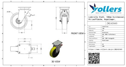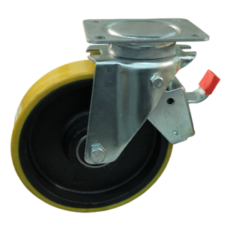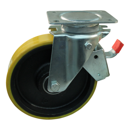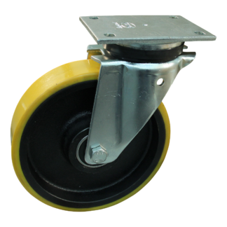 Dies ist eine Lenkrolle aus Stahl. Diese Rolle hat eine Radbremse. Die Lenkrolle hat die folgende Befestigungsart: Platte. Die Bauhöhe beträgt 210 millimeter. Das Material der Felge ist Gusseisen (RAL 9005 Tiefschwarz ist die Farbe) und der Lauffläche PU (Farbe RAL 1005 Honiggelb). Das Rad hat einen Durchmesser von 180 millimeter und eine Breite von 50 millimeter. Das Rad hat eine Tragfähigkeit von 900 kilo. Der Lagertyp: Kugellager. Dieses Produkt ist in unserem Shop in folgenden Kategorien erhältlich: Schwerlastlenkrollen mit Axiallager, Lenkrollen 800 kg, Schwerlastrollen, PU Rollen, Lenkrollen 180 mm, Polyurethan Rollen, Transportrollen, Lenkrollen mit Bremse, Schwerlastlenkrollen, Lenkrollen.