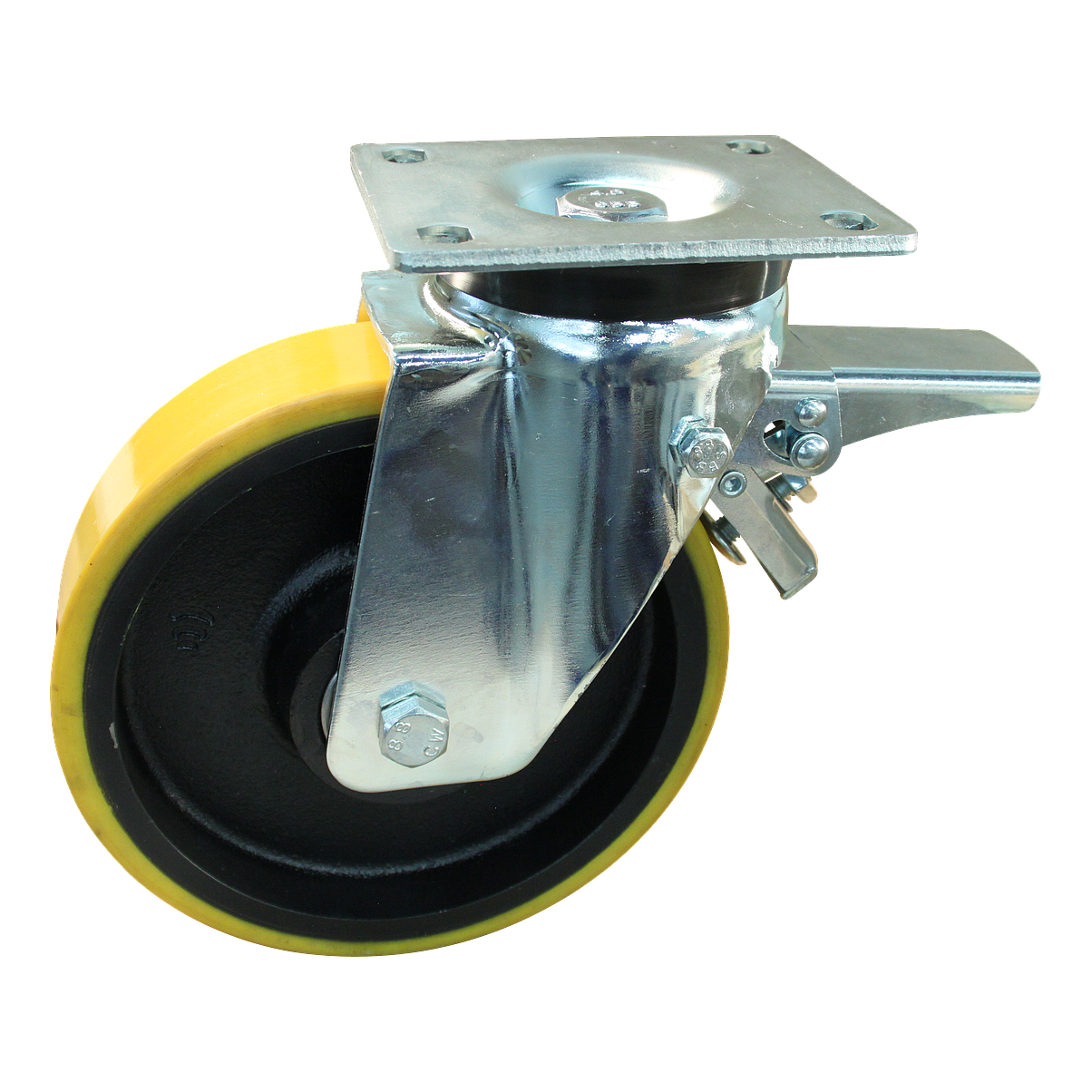 Dies ist eine Lenkrolle aus Stahl. Die Rolle hat eine Bremse des Typs Totalfeststeller, Vorlauf. Dies kann mit Befestigingsart „Platte“ befestigt werden. Die Bauhöhe ist 235 mm. Die Felge besteht aus Gusseisen (Farbe RAL 9005 Tiefschwarz) und die Lauffläche aus PU (RAL 1005 Honiggelb ist die Farbe). Das Rad hat einen Durchmesser von 180 mm und eine Breite von 50 mm. Das Rad hat eine Tragfähigkeit von 800 kilo. Das Rad hat ein Kugellager als Lagerung. Rollers.de hat dieses Produkt in die folgenden Kategorien eingeteilt: Lenkrollen 800 kg, Schwerlastrollen, PU Rollen, Lenkrollen 180 mm, Polyurethan Rollen, Transportrollen, Lenkrollen mit Bremse, Schwerlastlenkrollen, Lenkrollen.