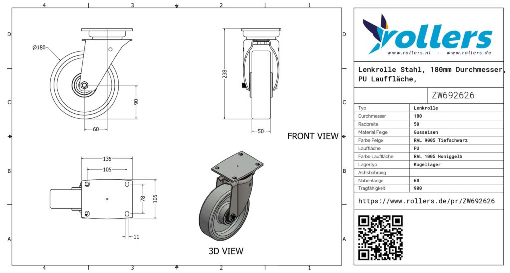 Diese Lenkrolle hat eine Gabel aus Stahl. Weise der Befestigung: Platte. Die Bauhöhe ist 210 millimeter. Die Felge besteht aus Gusseisen (Farbe RAL 9005 Tiefschwarz) und die Lauffläche aus PU (RAL 1005 Honiggelb ist die Farbe). Das Rad hat einen Durchmesser von 180 millimeter und eine Breite von 50 millimeter. Das Rad hat eine Tragfähigkeit von 900 kilogram. Das Rad hat ein Kugellager als Lagerung. Rollers.de hat dieses Produkt in die folgenden Kategorien eingeteilt: Schwerlastlenkrollen mit Axiallager, Lenkrollen 800 kg, Schwerlastrollen, PU Rollen, Lenkrollen 180 mm, Polyurethan Rollen, Transportrollen, Lenkrollen ohne Bremse, Schwerlastlenkrollen, Lenkrollen.