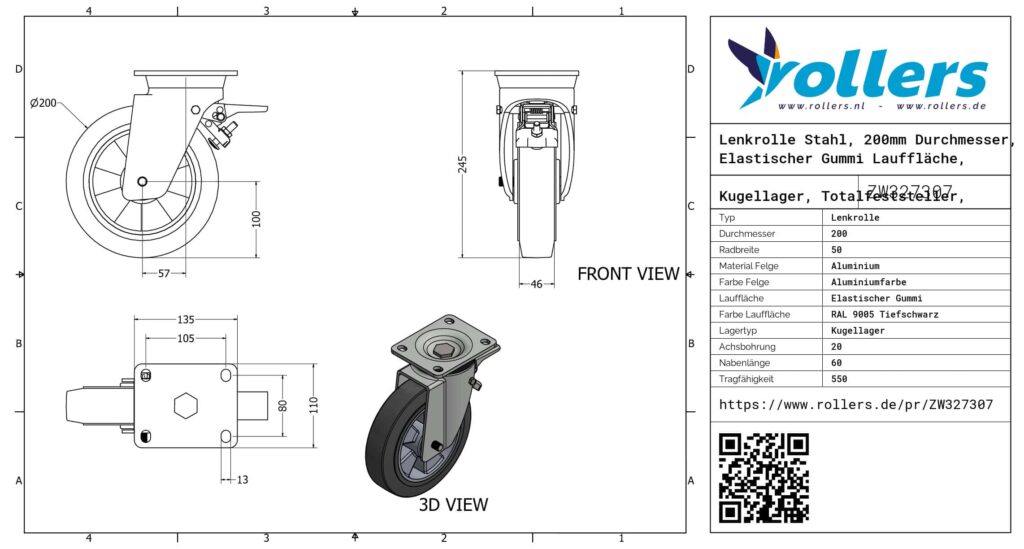 Diese Lenkrolle hat eine Gabel aus Stahl. Die Rolle hat eine Bremse des Typs Totalfeststeller, Vorlauf. Weise der Befestigung: Platte. Die Bauhöhe ist 245 mm. Die Felge besteht aus Aluminium und die Lauffläche aus Elastischer Gummi (RAL 9005 Tiefschwarz). Das Rad hat einen Durchmesser von 200 mm und eine Breite von 50 mm. Die Nabenlänge beträgt 60 mm und die Achsbohrung hat einen Durchmesser von 20 mm. Das Rad hat eine Tragfähigkeit von 550 kilogram. Der Lagertyp: Kugellager. Dieses Produkt finden Sie in unseren Kategorien: Gummiräder, Rollbehälter Rollen, Müllcontainer Rollen, Lenkrollen 500 kg, Schwerlastrollen, Gummi Lenkrollen, Lenkrollen 200 mm, Transportrollen, Lenkrollen mit Bremse, Schwerlastlenkrollen, Lenkrollen.
