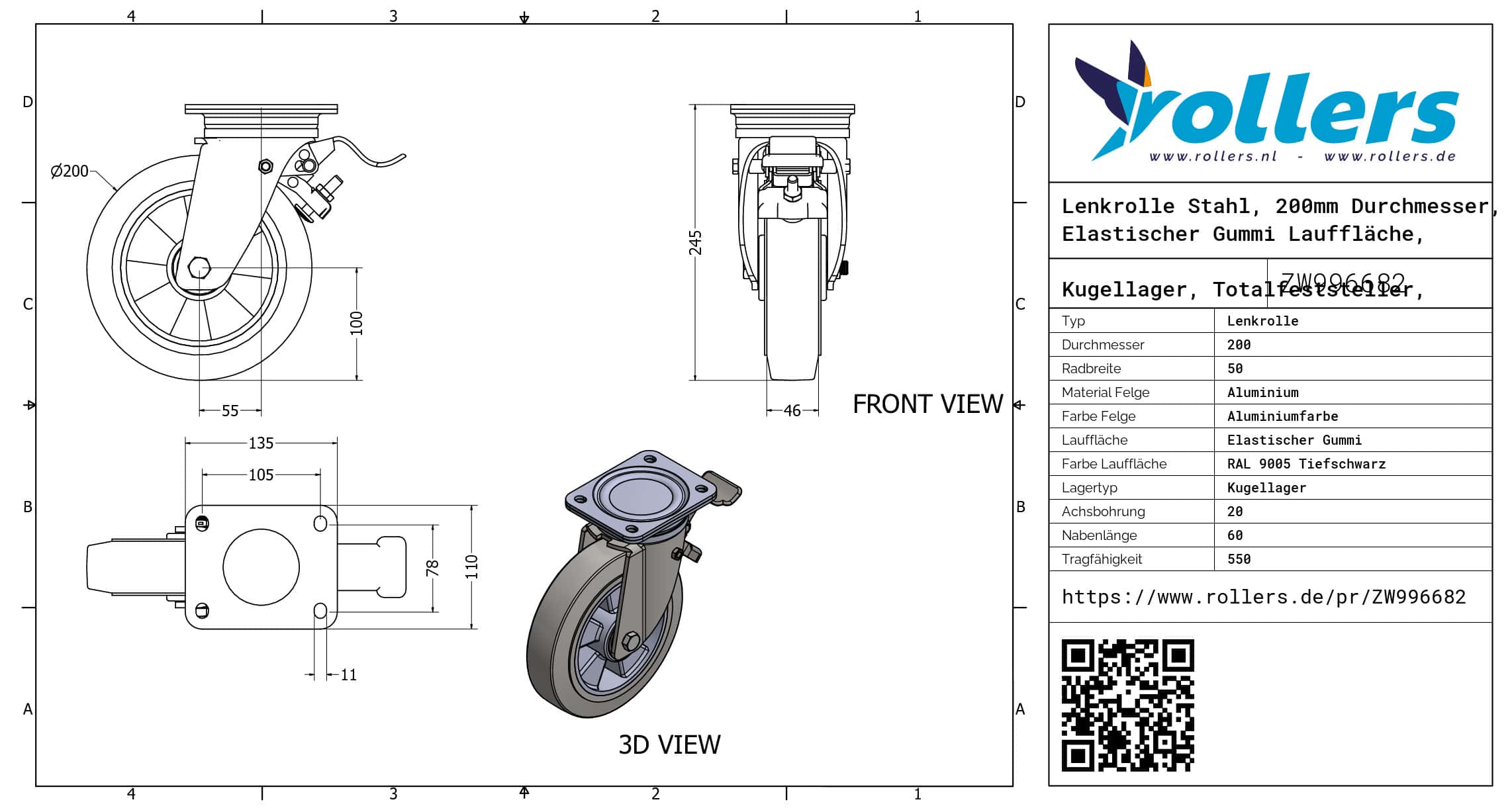 Dies ist eine Lenkrolle aus Stahl. Die Rolle hat eine Bremse des Typs Totalfeststeller, Vorlauf. Dies kann mit Befestigingsart „Platte“ befestigt werden. Die Bauhöhe ist 245 millimeter. Die Felge besteht aus Aluminium und die Lauffläche aus Elastischer Gummi (RAL 9005 Tiefschwarz ist die Farbe). Das Rad hat einen Durchmesser von 200 millimeter und eine Breite von 50 millimeter. Die Nabenlänge beträgt 60 millimeter mit einem Achsloch von 20 millimeter. Die Tragfähigkeit beträgt 550 kilo. Der Lagertyp: Kugellager. Rollers.de hat dieses Produkt in die folgenden Kategorien eingeteilt: Gummiräder, Rollbehälter Rollen, Müllcontainer Rollen, Lenkrollen 500 kg, Schwerlastrollen, Gummi Lenkrollen, Lenkrollen 200 mm, Transportrollen, Lenkrollen mit Bremse, Schwerlastlenkrollen, Lenkrollen.