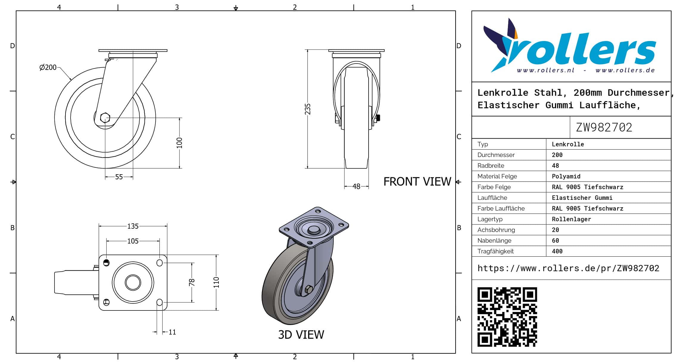 Diese Lenkrolle hat eine Gabel aus Stahl. Die Lenkrolle hat die folgende Befestigungsart: Platte. Die Bauhöhe beträgt 235 mm. Die Felge besteht aus Polyamid (RAL 9005 Tiefschwarz ist die Farbe) und die Lauffläche aus Elastischer Gummi (RAL 9005 Tiefschwarz ist die Farbe). Das Rad hat einen Durchmesser von 200 mm und eine Breite von 48 mm. Die Nabenlänge beträgt 60 mm und die Achsbohrung hat einen Durchmesser von 20 mm. Die Tragfähigkeit beträgt 400 kilogram. Der Lagertyp: Rollenlager. Dieses Produkt ist in unserem Shop in folgenden Kategorien erhältlich: Gummiräder, Rollbehälter Rollen, Müllcontainer Rollen, Lenkrollen 300 kg, Schwerlastrollen, Gummi Lenkrollen, Lenkrollen 200 mm, Transportrollen, Lenkrollen ohne Bremse, Schwerlastlenkrollen, Lenkrollen.