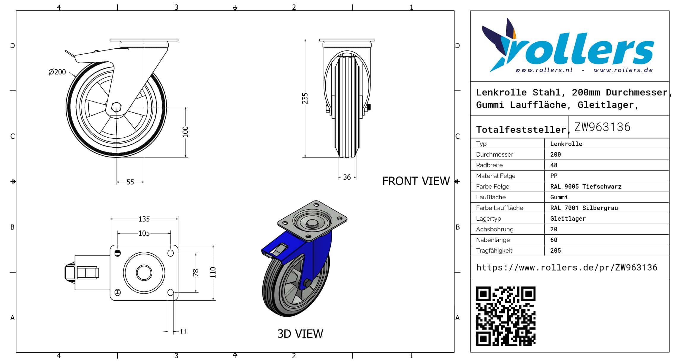 Dies ist eine Lenkrolle aus Stahl. Diese Rolle hat eine Totalfeststeller, Nachlauf. Die Lenkrolle hat die folgende Befestigungsart: Platte. Die Bauhöhe beträgt 235 millimeter. Die Felge besteht aus PP (Farbe RAL 9005 Tiefschwarz) und die Lauffläche aus Gummi (RAL 7001 Silbergrau). Das Rad hat einen Durchmesser von 200 millimeter und eine Breite von 48 millimeter. Die Nabenlänge beträgt 60 millimeter mit einem Achsloch von 20 millimeter. Das Rad hat eine Tragfähigkeit von 205 kg. Das Rad hat ein Gleitlager als Lagerung. Dieses Produkt finden Sie in unseren Kategorien: Gummiräder, Rollbehälter Rollen, Müllcontainer Rollen, Lenkrollen 200 kg, Gummi Lenkrollen, Lenkrollen 200 mm, Transportrollen, Lenkrollen mit Bremse, Lenkrollen.
