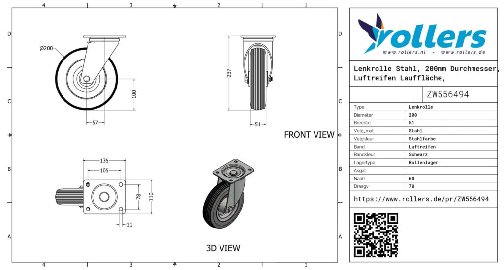 Lenkrolle Stahl, 200mm Durchmesser, Luftreifen Lauffläche, Rollenlager