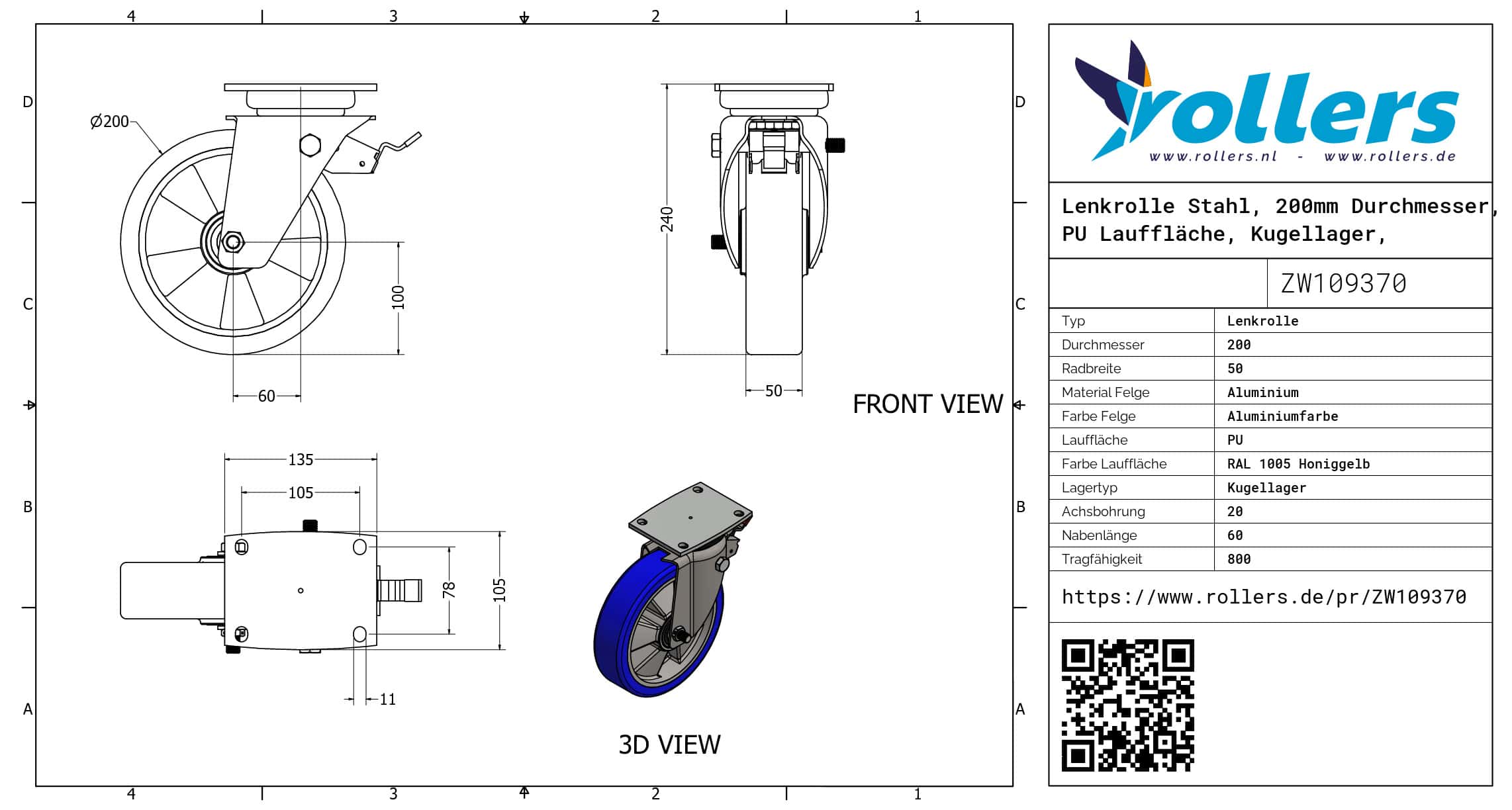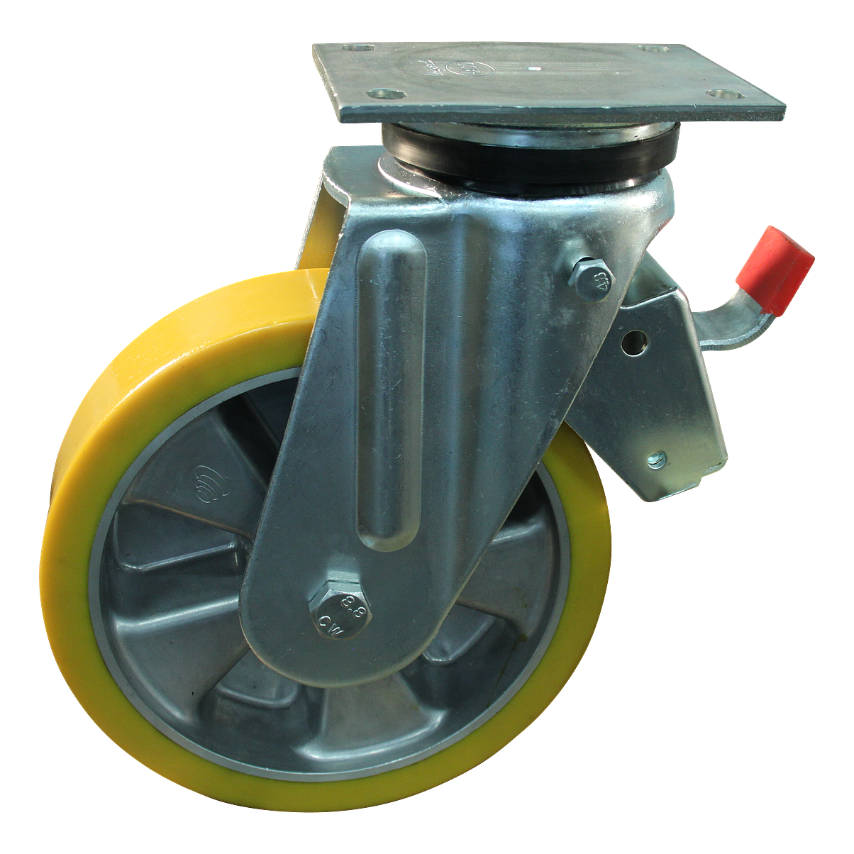 Diese Lenkrolle hat eine Gabel aus Stahl. Die Bremse ist vom Typ: Radbremse. Weise der Befestigung: Platte. Die Bauhöhe beträgt 248 millimeter. Das Material der Felge ist Aluminium und der Lauffläche PU (RAL 1005 Honiggelb). Das Rad hat einen Durchmesser von 200 millimeter und eine Breite von 50 millimeter. Die Nabenlänge beträgt 60 millimeter und die Achsbohrung hat einen Durchmesser von 20 millimeter. Die Tragfähigkeit beträgt 800 kilo. Das Rad hat ein Kugellager als Lagerung. Dieses Produkt ist in unserem Shop in folgenden Kategorien erhältlich: Schwerlastlenkrollen mit Axiallager, Lenkrollen 800 kg, Schwerlastrollen, PU Rollen, Polyurethan Rollen, Lenkrollen 200 mm, Transportrollen, Lenkrollen mit Bremse, Schwerlastlenkrollen, Lenkrollen.