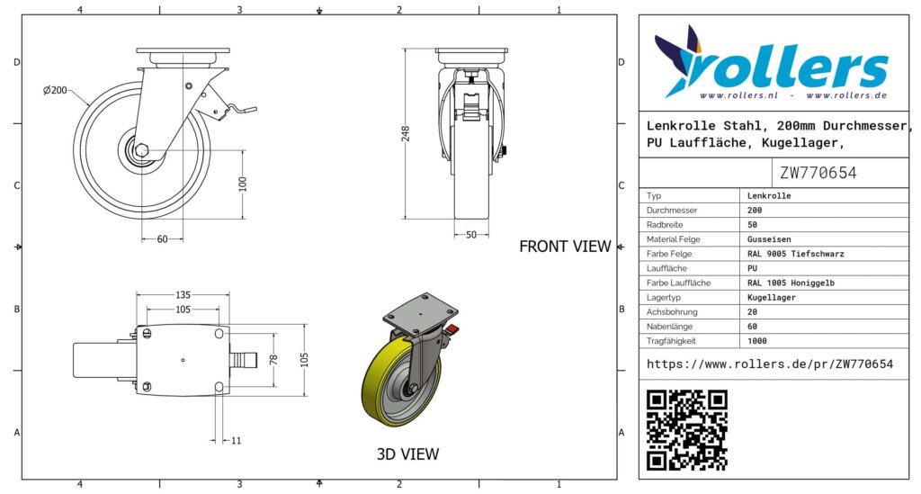 Dies ist eine Lenkrolle aus Stahl. Diese Rolle hat eine Radbremse. Dies kann mit Befestigingsart „Platte“ befestigt werden. Die Bauhöhe beträgt 248 millimeter. Das Material der Felge ist Gusseisen (RAL 9005 Tiefschwarz) und der Lauffläche PU (RAL 1005 Honiggelb ist die Farbe). Das Rad hat einen Durchmesser von 200 millimeter und eine Breite von 50 millimeter. Die Nabenlänge beträgt 60 millimeter und die Achsbohrung hat einen Durchmesser von 20 millimeter. Die Lenkrolle hat eine Tragfähigkeit von 1000 kilogram. Der Lagertyp: Kugellager. Dieses Produkt ist in unserem Shop in folgenden Kategorien erhältlich: Schwerlastlenkrollen mit Axiallager, Lenkrollen 1000 kg, Schwerlastrollen, PU Rollen, Polyurethan Rollen, Lenkrollen 200 mm, Transportrollen, Lenkrollen mit Bremse, Schwerlastlenkrollen, Lenkrollen.