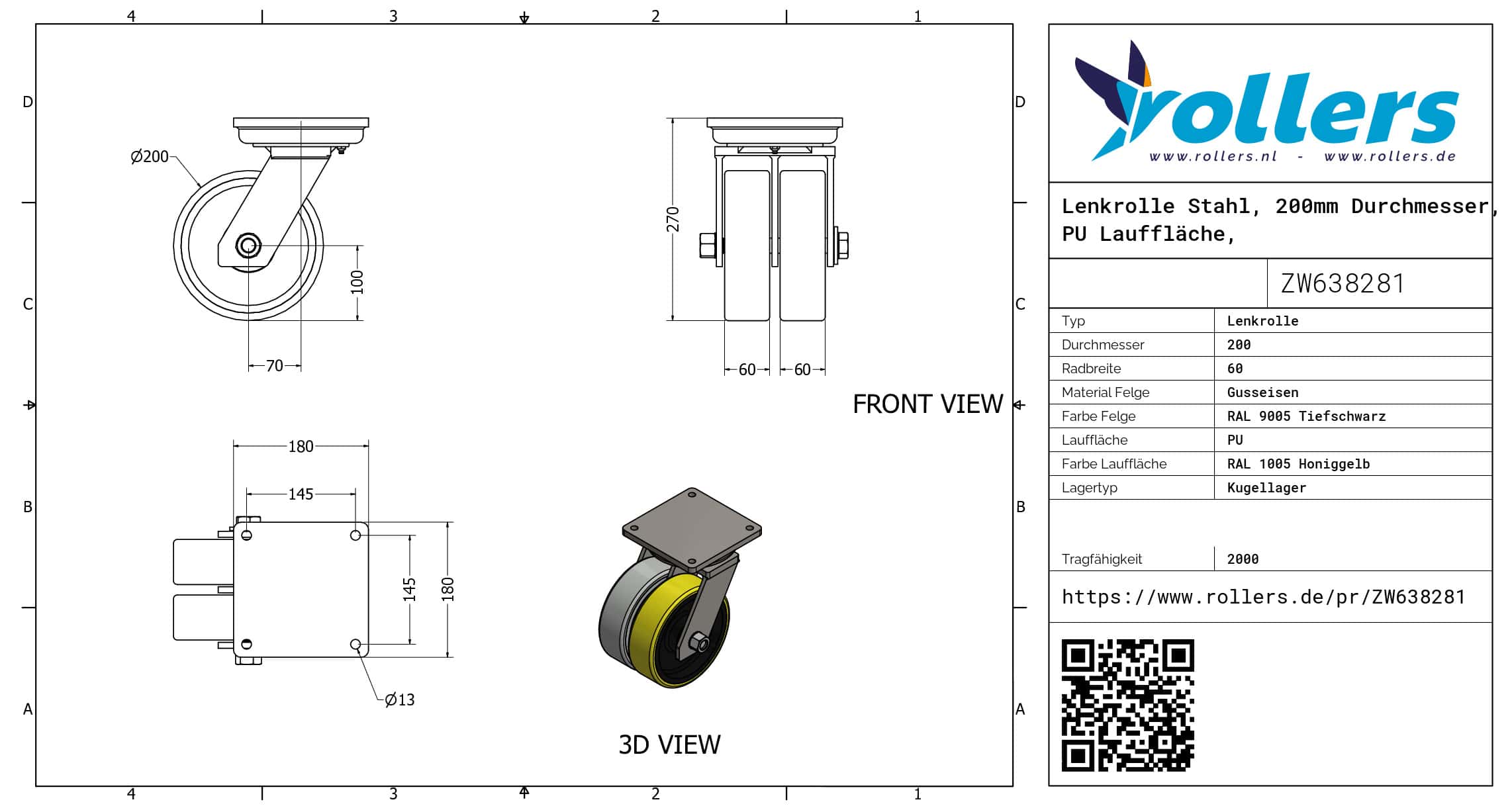 Dies ist eine Lenkrolle mit einem Gabel aus Stahl. Dies kann mit Befestigingsart „Platte“ befestigt werden. Die Bauhöhe beträgt 270 millimeter. Die Felge besteht aus Gusseisen (Farbe RAL 9005 Tiefschwarz) und die Lauffläche aus PU (RAL 1005 Honiggelb ist die Farbe). Das Rad hat einen Durchmesser von 200 millimeter und eine Breite von 60 millimeter. Die Tragfähigkeit beträgt 2000 kg. Der Lagertyp: Kugellager. Dieses Produkt ist in unserem Shop in folgenden Kategorien erhältlich: Lenkrollen 1000 kg, Schwerlastrollen, PU Rollen, Polyurethan Rollen, Lenkrollen 200 mm, Transportrollen, Lenkrollen ohne Bremse, Schwerlastlenkrollen, Lenkrollen.