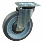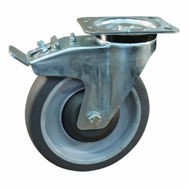 Diese Lenkrolle hat eine Gabel aus Stahl. Die Rolle hat eine Bremse des Typs Totalfeststeller, Nachlauf. Weise der Befestigung: Platte. Die Bauhöhe ist 235 millimeter. Das Material der Felge ist PP (RAL 7001 Silbergrau) und der Lauffläche TPE (RAL 7024 Graphitgrau). Das Rad hat einen Durchmesser von 200 millimeter und eine Breite von 50 millimeter. Die Tragfähigkeit beträgt 300 kilogram. Das Rad hat ein Kugellager als Lagerung. Marke: Novio.