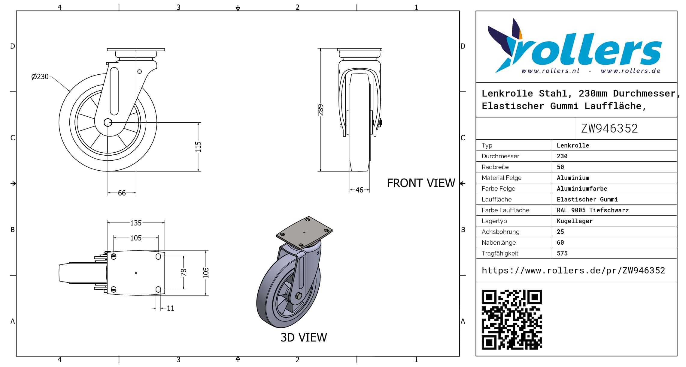 Dies ist eine Lenkrolle aus Stahl. Dies kann mit Befestigingsart „Platte“ befestigt werden. Die Bauhöhe beträgt 261 millimeter. Das Material der Felge ist Aluminium und der Lauffläche Elastischer Gummi (Farbe RAL 9005 Tiefschwarz). Das Rad hat einen Durchmesser von 230 millimeter und eine Breite von 50 millimeter. Die Nabenlänge beträgt 60 millimeter mit einem Achsloch von 25 millimeter. Die Lenkrolle hat eine Tragfähigkeit von 575 kg. Das Rad hat ein Kugellager als Lagerung. Rollers.de hat dieses Produkt in die folgenden Kategorien eingeteilt: Gummiräder, Schwerlastlenkrollen mit Axiallager, Lenkrollen 500 kg, Schwerlastrollen, Lenkrollen 230 mm, Gummi Lenkrollen, Transportrollen, Lenkrollen ohne Bremse, Schwerlastlenkrollen, Lenkrollen.