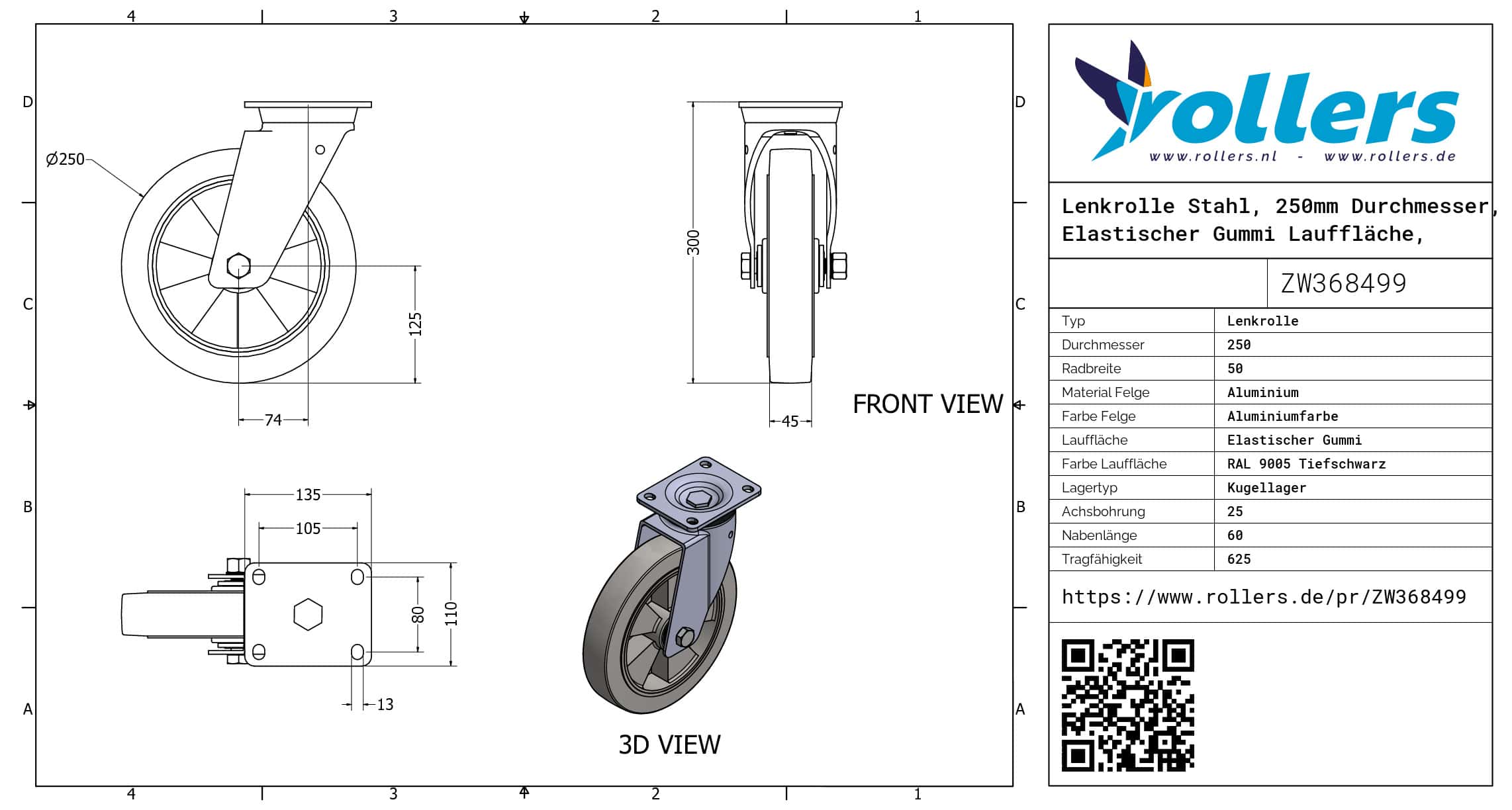 Diese Lenkrolle hat eine Gabel aus Stahl. Dies kann mit Befestigingsart „Platte“ befestigt werden. Die Bauhöhe beträgt 300 mm. Die Felge besteht aus Aluminium und die Lauffläche aus Elastischer Gummi (Farbe RAL 9005 Tiefschwarz). Das Rad hat einen Durchmesser von 250 mm und eine Breite von 50 mm. Die Nabenlänge beträgt 60 mm und die Achsbohrung hat einen Durchmesser von 25 mm. Die Tragfähigkeit beträgt 625 kilogram. Der Lagertyp: Kugellager. Dieses Produkt finden Sie in unseren Kategorien: Gummiräder, Lenkrollen 500 kg, Schwerlastrollen, Lenkrollen 250 mm, Gummi Lenkrollen, Transportrollen, Lenkrollen ohne Bremse, Schwerlastlenkrollen, Lenkrollen.