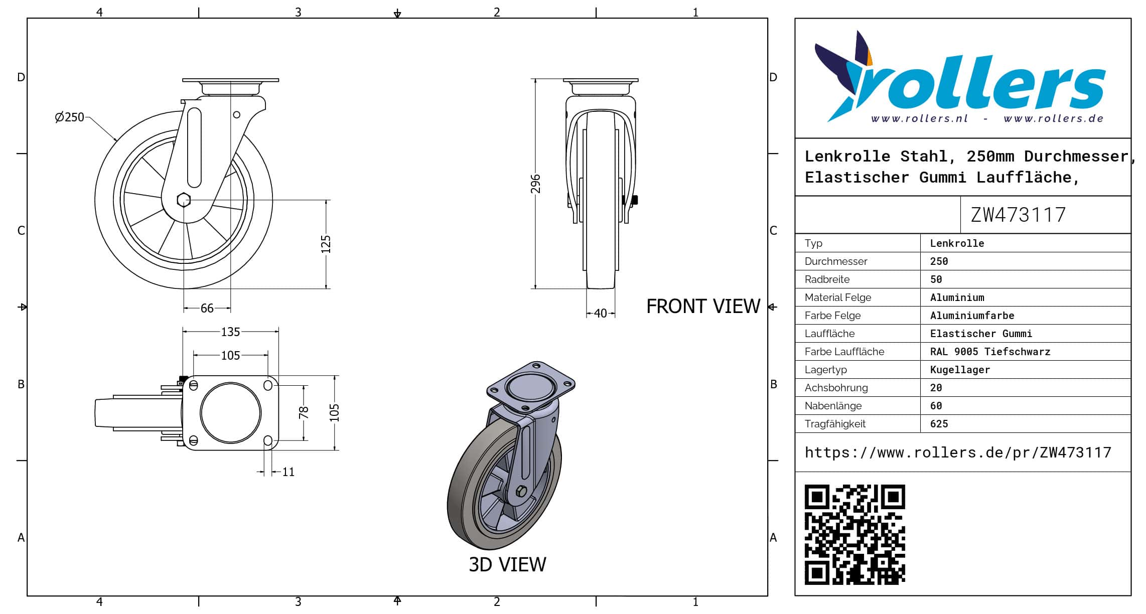 Diese Lenkrolle hat eine Gabel aus Stahl. Dies kann mit Befestigingsart „Platte“ befestigt werden. Die Rolle hat eine Bauhöhe von 296 mm. Das Material der Felge ist Aluminium und der Lauffläche Elastischer Gummi (Farbe RAL 9005 Tiefschwarz). Das Rad hat einen Durchmesser von 250 mm und eine Breite von 50 mm. Die Nabenlänge beträgt 60 mm und die Achsbohrung hat einen Durchmesser von 20 mm. Die Tragfähigkeit beträgt 625 kg. Das Rad hat ein Kugellager als Lagerung. Rollers.de hat dieses Produkt in die folgenden Kategorien eingeteilt: Gummiräder, Schwerlastlenkrollen mit Axiallager, Lenkrollen 500 kg, Schwerlastrollen, Lenkrollen 250 mm, Gummi Lenkrollen, Transportrollen, Lenkrollen ohne Bremse, Schwerlastlenkrollen, Lenkrollen.