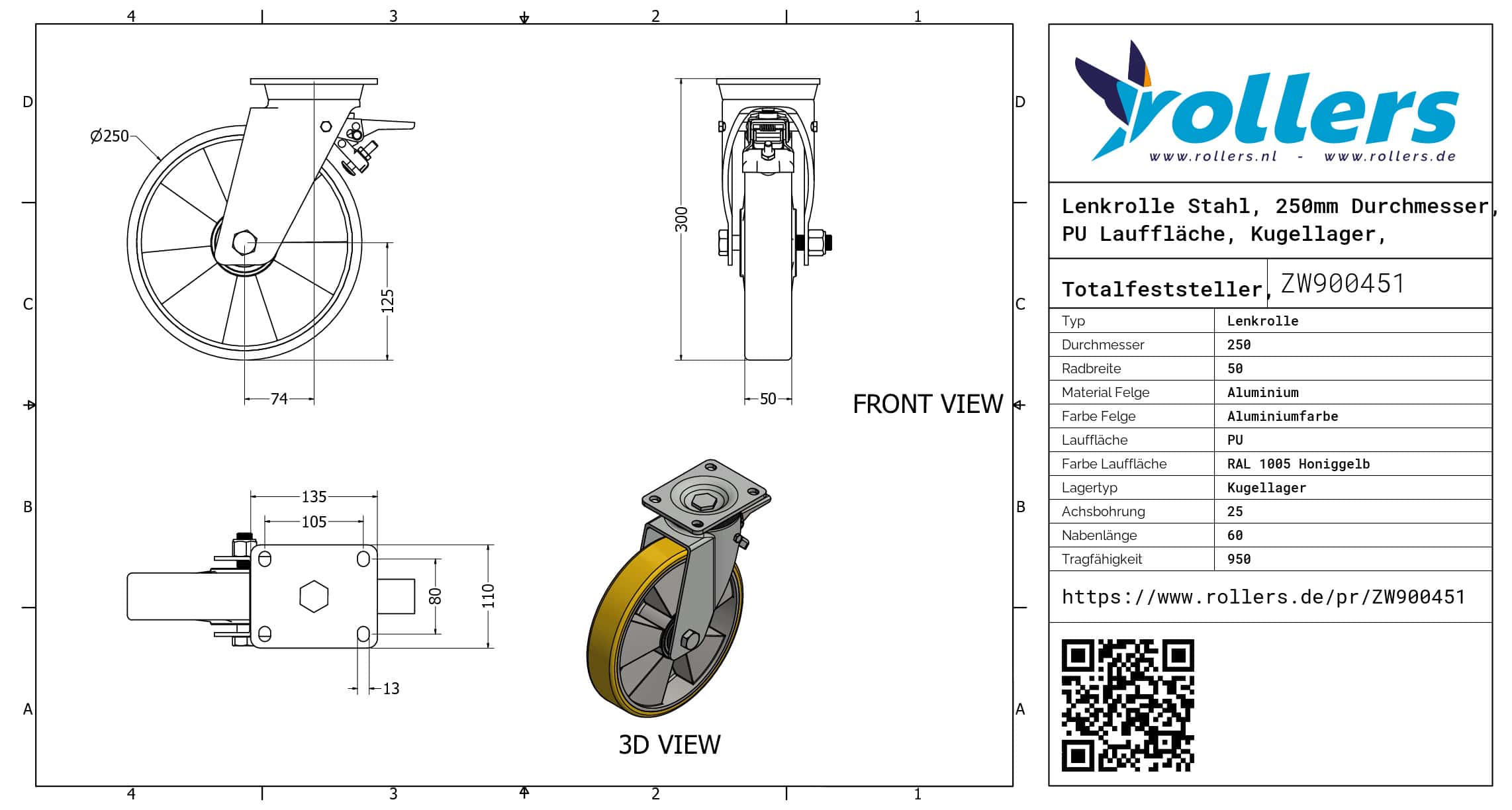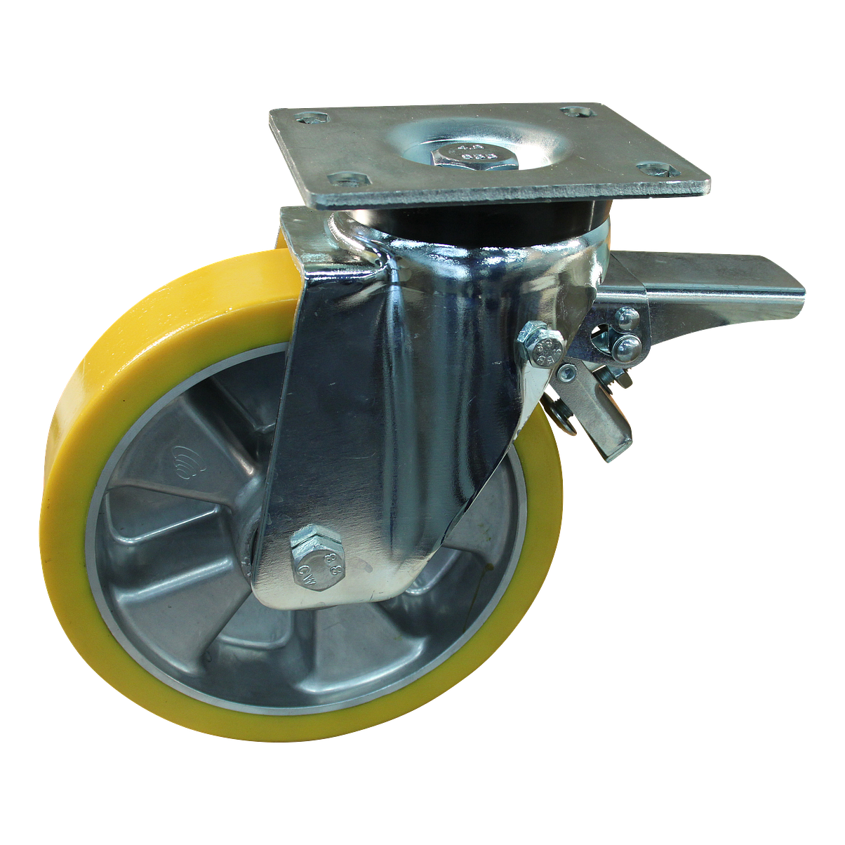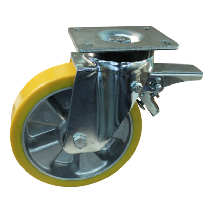 Diese Lenkrolle hat eine Gabel aus Stahl. Die Bremse ist vom Typ: Totalfeststeller, Vorlauf. Die Lenkrolle hat die folgende Befestigungsart: Platte. Die Bauhöhe ist 300 mm. Die Felge besteht aus Aluminium und die Lauffläche aus PU (RAL 1005 Honiggelb). Das Rad hat einen Durchmesser von 250 mm und eine Breite von 50 mm. Die Nabenlänge beträgt 60 mm mit einem Achsloch von 25 mm. Die Tragfähigkeit beträgt 950 kg. Der Lagertyp: Kugellager. Dieses Produkt finden Sie in unseren Kategorien: Lenkrollen 800 kg, Schwerlastrollen, PU Rollen, Lenkrollen 250 mm, Polyurethan Rollen, Transportrollen, Lenkrollen mit Bremse, Schwerlastlenkrollen, Lenkrollen.