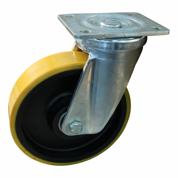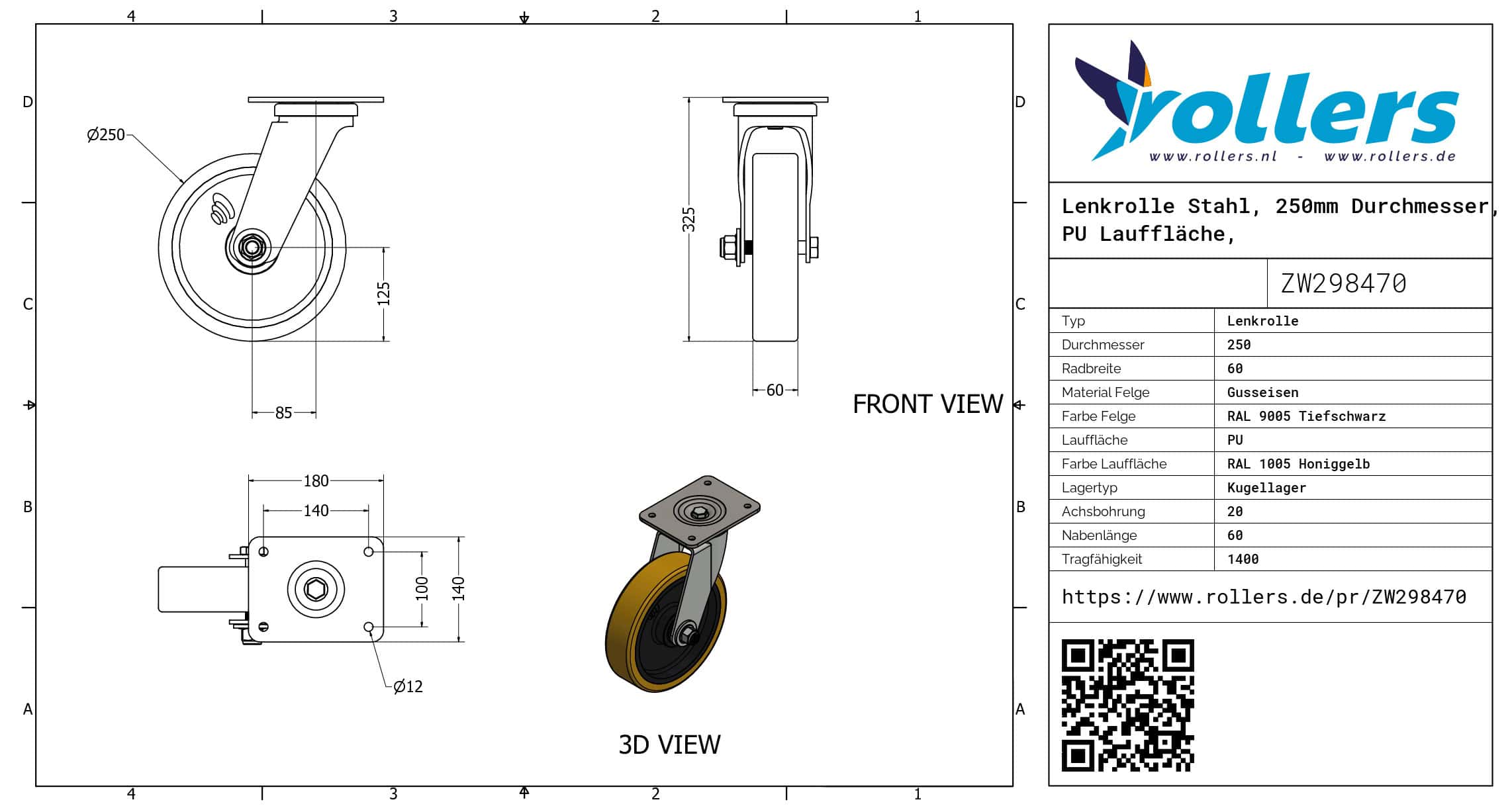 Dies ist eine Lenkrolle aus Stahl. Dies kann mit Befestigingsart „Platte“ befestigt werden. Die Bauhöhe ist 325 millimeter. Das Material der Felge ist Gusseisen (Farbe RAL 9005 Tiefschwarz) und der Lauffläche PU (RAL 1005 Honiggelb). Das Rad hat einen Durchmesser von 250 millimeter und eine Breite von 60 millimeter. Die Nabenlänge beträgt 60 millimeter mit einem Achsloch von 20 millimeter. Die Tragfähigkeit beträgt 1400 kg. Das Rad hat ein Kugellager als Lagerung.