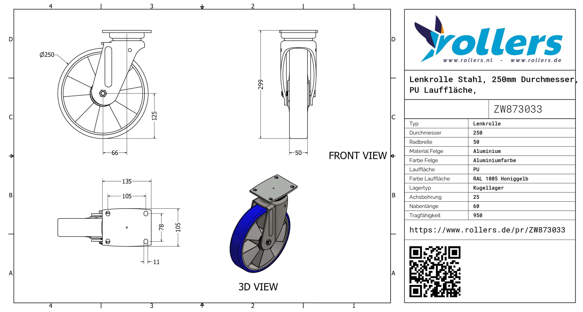 Dies ist eine Lenkrolle mit einem Gabel aus Stahl. Die Lenkrolle hat die folgende Befestigungsart: Platte. Die Rolle hat eine Bauhöhe von 299 millimeter. Die Felge besteht aus Aluminium und die Lauffläche aus PU (Farbe RAL 1005 Honiggelb). Das Rad hat einen Durchmesser von 250 millimeter und eine Breite von 50 millimeter. Die Nabenlänge beträgt 60 millimeter mit einem Achsloch von 25 millimeter. Die Tragfähigkeit beträgt 950 kg. Das Rad hat ein Kugellager als Lagerung. Dieses Produkt ist in unserem Shop in folgenden Kategorien erhältlich: Schwerlastlenkrollen mit Axiallager, Lenkrollen 800 kg, Schwerlastrollen, PU Rollen, Lenkrollen 250 mm, Polyurethan Rollen, Transportrollen, Lenkrollen ohne Bremse, Schwerlastlenkrollen, Lenkrollen.