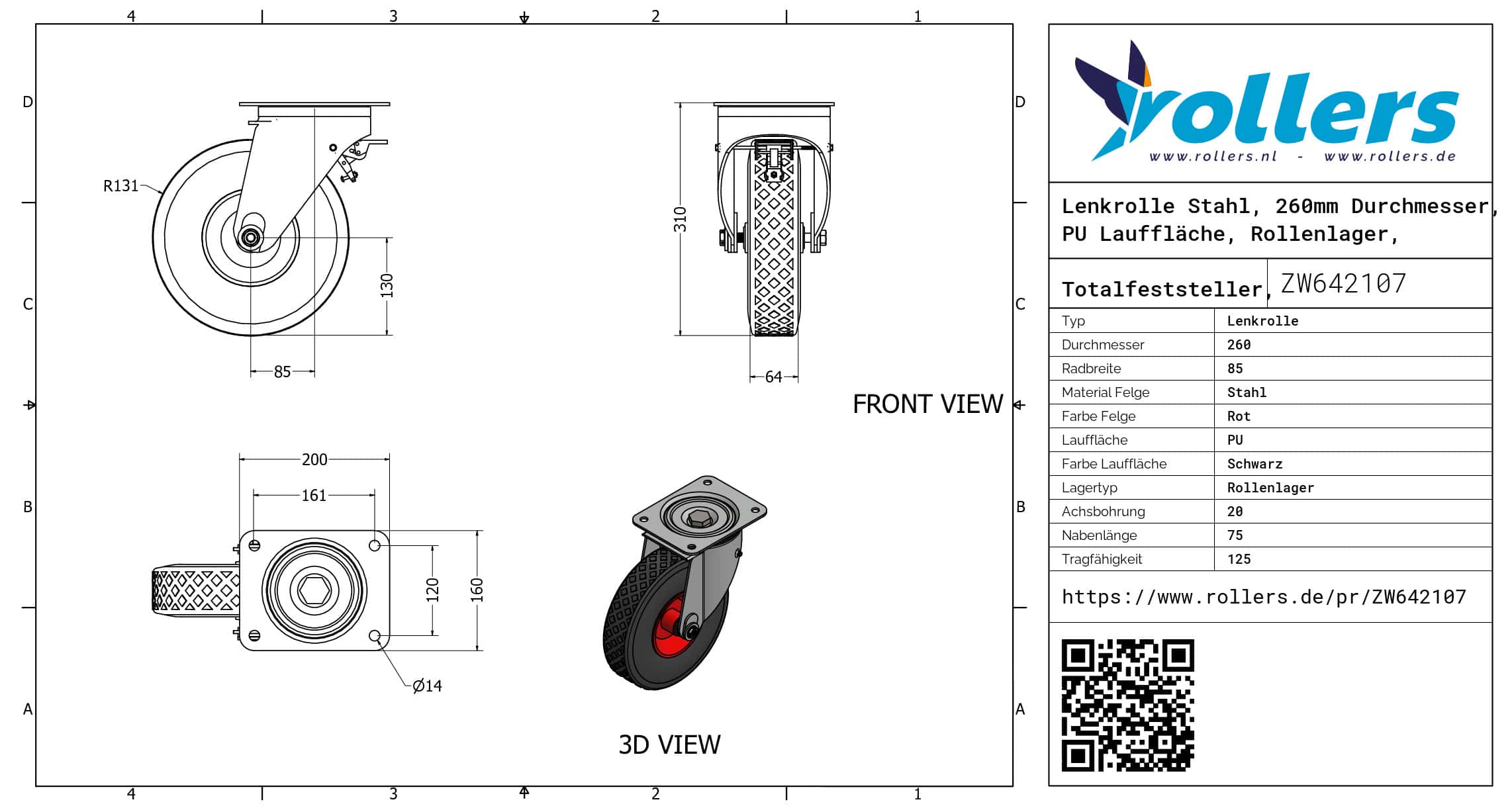 Diese Lenkrolle hat eine Gabel aus Stahl. Die Rolle hat eine Bremse des Typs Totalfeststeller, Vorlauf. Dies kann mit Befestigingsart „Platte“ befestigt werden. Die Rolle hat eine Bauhöhe von 305 millimeter. Das Material der Felge ist Stahl (rot) und der Lauffläche PU (schwarz). Das Rad hat einen Durchmesser von 260 millimeter und eine Breite von 85 millimeter. Die Nabenlänge beträgt 75 millimeter mit einem Achsloch von 20 millimeter. Die Tragfähigkeit beträgt 125 kilogram. Der Lagertyp: Rollenlager. Dieses Produkt finden Sie in unseren Kategorien: PU Rollen, Lenkrollen 260 mm, Polyurethan Rollen, Lenkrollen 100 kg, Transportrollen, Lenkrollen mit Bremse, Lenkrollen.