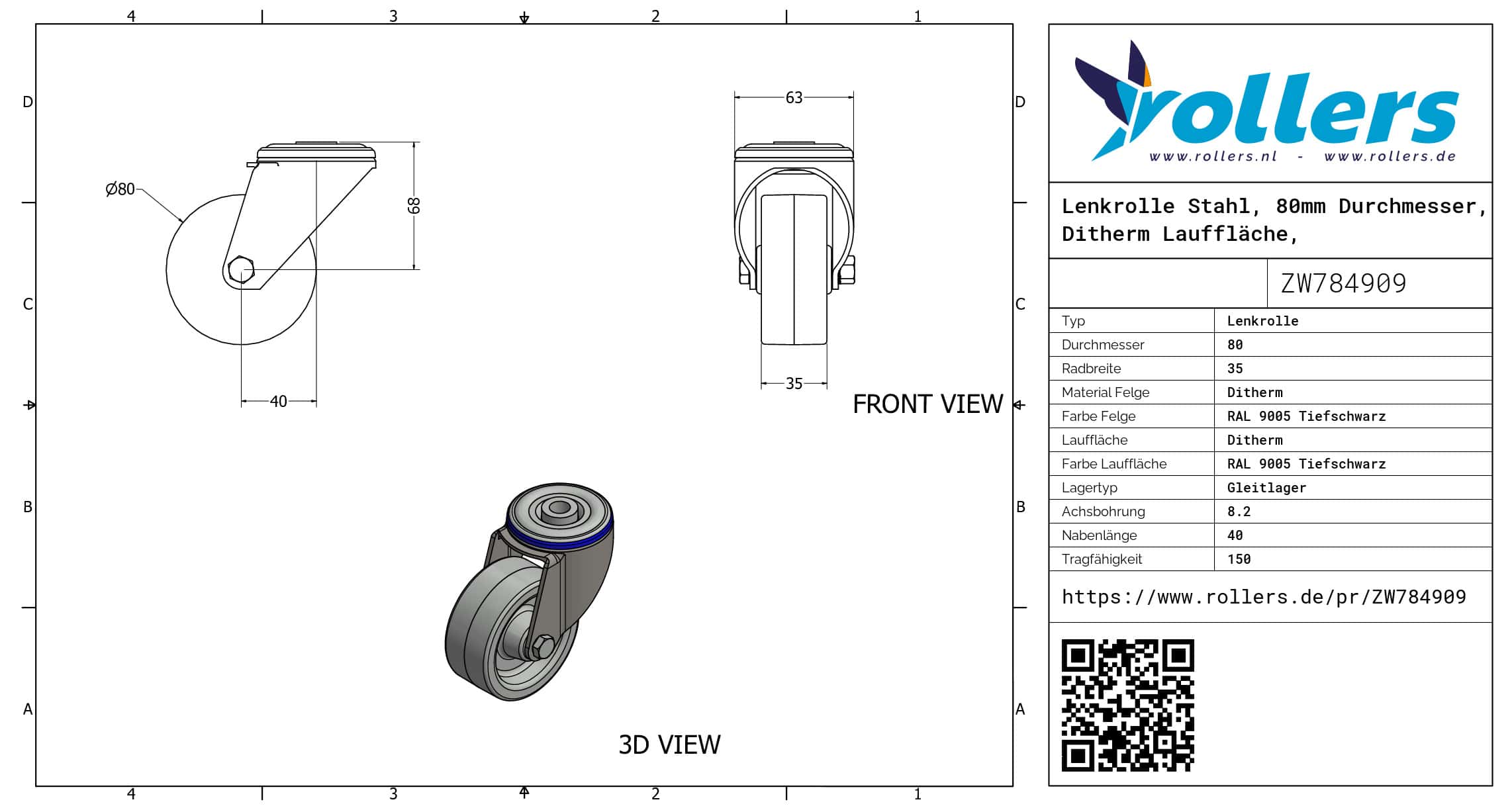 Lenkrolle Stahl, 80mm Durchmesser, Ditherm Lauffläche, Gleitlager