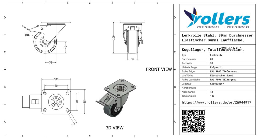 Dies ist eine Lenkrolle mit einem Gabel aus Stahl. Die Bremse ist vom Typ: Totalfeststeller, Nachlauf. Die Lenkrolle hat die folgende Befestigungsart: Platte. Die Bauhöhe beträgt 108 mm. Die Felge besteht aus Polyamid (Farbe RAL 9005 Tiefschwarz) und die Lauffläche aus Elastischer Gummi (RAL 7001 Silbergrau). Das Rad hat einen Durchmesser von 80 mm und eine Breite von 35 mm. Die Tragfähigkeit beträgt 100 kg. Der Lagertyp: Kugellager. Rollers.de hat dieses Produkt in die folgenden Kategorien eingeteilt: Gummiräder, Kleine Lenkrollen mit Feststeller, Kleine Lenkrollen, Rollbehälter Rollen, Müllcontainer Rollen, Lenkrollen 80 mm, Gummi Lenkrollen, Lenkrollen 100 kg, Transportrollen, Lenkrollen mit Bremse, Lenkrollen.