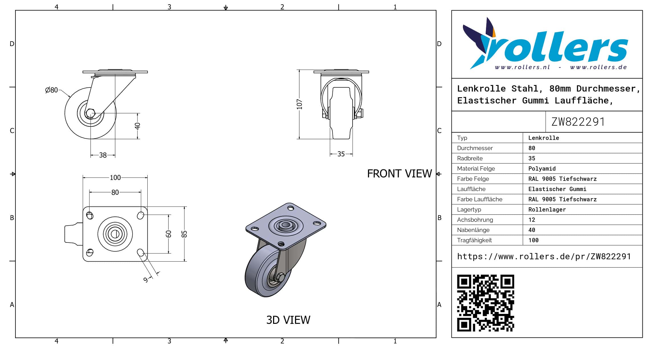 Dies ist eine Lenkrolle aus Stahl. Dies kann mit Befestigingsart „Platte“ befestigt werden. Die Rolle hat eine Bauhöhe von 108 millimeter. Die Felge besteht aus Polyamid (Farbe RAL 9005 Tiefschwarz) und die Lauffläche aus Elastischer Gummi (RAL 9005 Tiefschwarz). Das Rad hat einen Durchmesser von 80 millimeter und eine Breite von 35 millimeter. Die Nabenlänge beträgt 40 millimeter mit einem Achsloch von 12 millimeter. Die Lenkrolle hat eine Tragfähigkeit von 100 kilo. Das Rad hat ein Rollenlager als Lagerung. Dieses Produkt ist in unserem Shop in folgenden Kategorien erhältlich: Gummiräder, Kleine Lenkrollen, Rollbehälter Rollen, Müllcontainer Rollen, Lenkrollen 80 mm, Gummi Lenkrollen, Lenkrollen 100 kg, Transportrollen, Lenkrollen ohne Bremse, Lenkrollen.