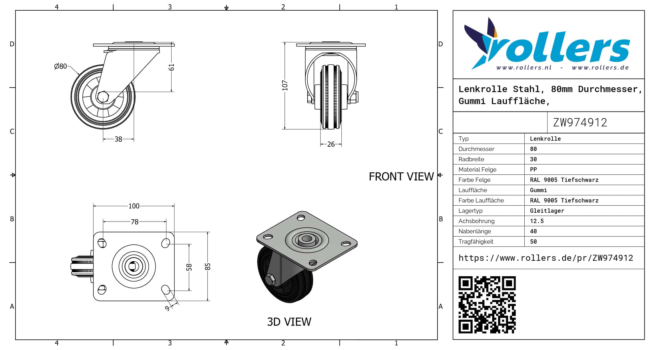Dies ist eine Lenkrolle aus Stahl. Weise der Befestigung: Platte. Die Bauhöhe ist 108 mm. Das Material der Felge ist PP (RAL 9005 Tiefschwarz) und der Lauffläche Gummi (Farbe RAL 9005 Tiefschwarz). Das Rad hat einen Durchmesser von 80 mm und eine Breite von 30 mm. Die Nabenlänge beträgt 40 mm und die Achsbohrung hat einen Durchmesser von 12.5 mm. Die Tragfähigkeit beträgt 50 kg. Der Lagertyp: Gleitlager. Dieses Produkt finden Sie in unseren Kategorien: Gummiräder, Kleine Lenkrollen, Lenkrollen 50 kg, Lenkrollen 80 mm, Gummi Lenkrollen, Transportrollen, Lenkrollen ohne Bremse, Lenkrollen.