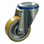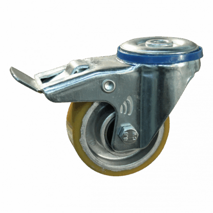 Dies ist eine Lenkrolle mit einem Gabel aus Stahl. Die Bremse ist vom Typ: Totalfeststeller, Nachlauf. Dies kann mit Befestigingsart „Bolzenloch“ befestigt werden. Die Bauhöhe beträgt 105 millimeter. Das Material der Felge ist Aluminium und der Lauffläche PU (Farbe RAL 1005 Honiggelb). Das Rad hat einen Durchmesser von 80 millimeter und eine Breite von 30 millimeter. Die Nabenlänge beträgt 40 millimeter mit einem Achsloch von 15 millimeter. Die Tragfähigkeit beträgt 175 kilogram. Das Rad hat ein Kugellager als Lagerung.