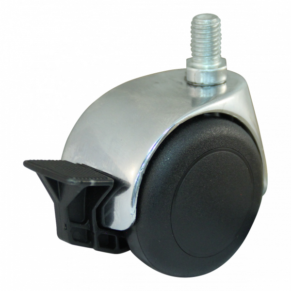 Dies ist eine Lenkrolle aus Verchromt. Diese Rolle hat eine Radbremse. Die Rolle hat die folgende Befestigungsart: Gewindestift. Die Bauhöhe beträgt 62 mm. Die Felge besteht aus Polyamid (RAL 9005 Tiefschwarz ist die Farbe) und die Lauffläche aus Polyamid (Farbe RAL 9005 Tiefschwarz). Das Rad hat einen Durchmesser von 52 mm und eine Breite von 8 mm. Die Tragfähigkeit beträgt 40 kilo. Der Lagertyp: Gleitlager. Marke: Novio.