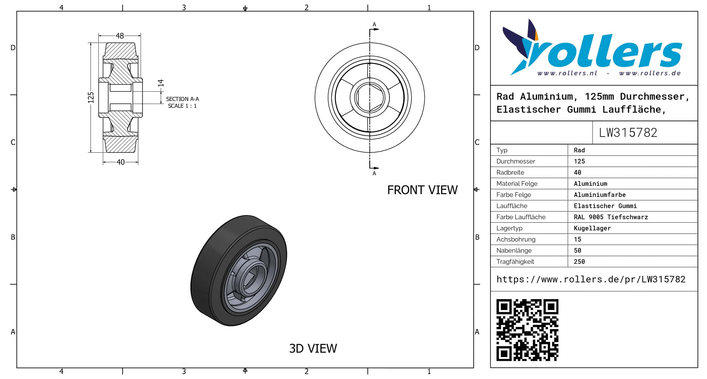 Dies ist ein loses Rad aus Aluminium. Die Felge besteht aus Aluminium und die Lauffläche aus Elastischer Gummi (RAL 9005 Tiefschwarz ist die Farbe). Das Rad hat einen Durchmesser von 125 millimeter und eine Breite von 40 millimeter. Die Nabenlänge beträgt 50 millimeter mit einem Achsloch von 15 millimeter. Das Rad hat eine Tragfähigkeit von 250 kg. Das Rad hat ein Kugellager als Lagerung. Dieses Produkt ist in unserem Shop in folgenden Kategorien erhältlich: Räder mit Lager, Gummiräder, Müllcontainer Rollen, Räder 125 mm, Räder 200 kg, Transportrollen, Räder.