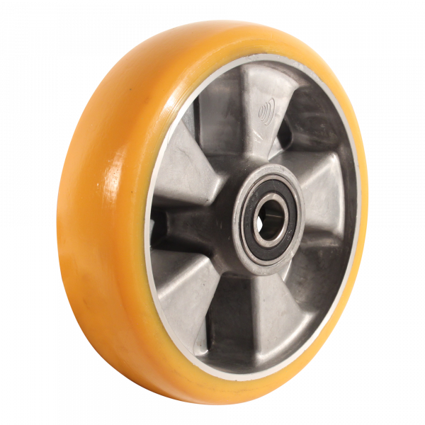 Dies ist ein loses Rad aus Aluminium. Die Felge besteht aus Aluminium und die Lauffläche aus PU (RAL 1005 Honiggelb). Das Rad hat einen Durchmesser von 250 millimeter und eine Breite von 60 millimeter. Die Nabenlänge beträgt 60 millimeter und die Achsbohrung hat einen Durchmesser von 25 millimeter. Die Tragfähigkeit beträgt 950 kg. Das Rad hat ein Kugellager als Lagerung.