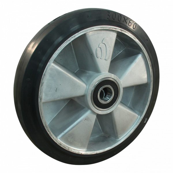 Dies ist ein loses Rad aus Aluminium. Das Material der Felge ist Aluminium und der Lauffläche Elastischer Gummi (RAL 9005 Tiefschwarz ist die Farbe). Das Rad hat einen Durchmesser von 300 millimeter und eine Breite von 60 millimeter. Die Nabenlänge beträgt 75 millimeter und die Achsbohrung hat einen Durchmesser von 25 millimeter. Die Rolle hat eine Tragfähigkeit von 750 kilogram. Der Lagertyp: Kugellager.