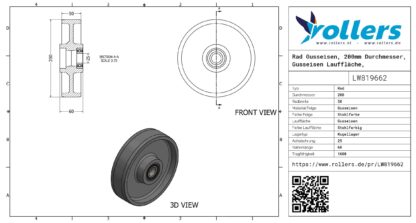 Dies ist ein loses Rad des Materials Gusseisen. Die Felge besteht aus Gusseisen (Farbe Stahlfarbe) und die Lauffläche aus Gusseisen (Farbe stahlfarbig). Das Rad hat einen Durchmesser von 200 millimeter und eine Breite von 50 millimeter. Die Nabenlänge beträgt 60 millimeter und die Achsbohrung hat einen Durchmesser von 25 millimeter. Die Tragfähigkeit beträgt 1600 kg. Das Rad hat ein Kugellager als Lagerung. Dieses Produkt finden Sie in unseren Kategorien: Räder mit Lager, Räder 1600 kg, Räder 200 mm, Schwerlastrollen, Transportrollen, Räder.