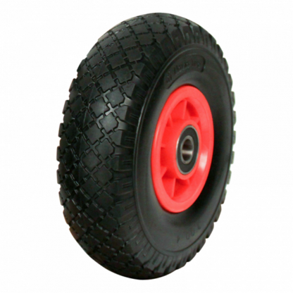 Dies ist ein loses Rad aus Kunststoff. Die Felge besteht aus Kunststoff (rot) und die Lauffläche aus PU (schwarz). Das Rad hat einen Durchmesser von 260 millimeter und eine Breite von 85 millimeter. Die Nabenlänge beträgt 75 millimeter und die Achsbohrung hat einen Durchmesser von 20 millimeter. Das Rad hat eine Tragfähigkeit von 100 kilogram. Der Lagertyp: Kugellager.