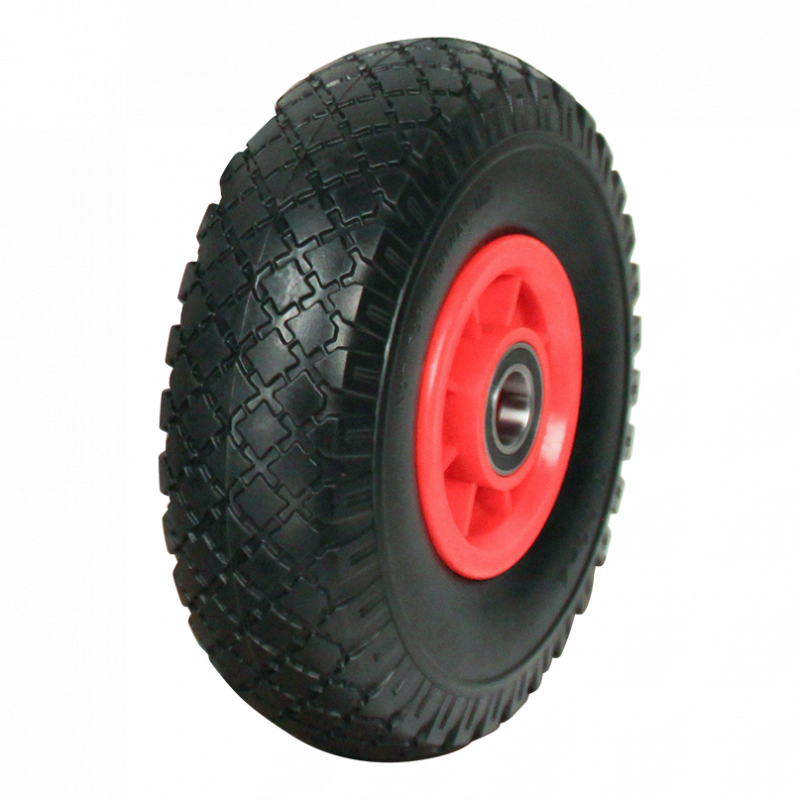 Dies ist ein loses Rad aus Kunststoff. Das Material der Felge ist Kunststoff (rot ist die Farbe) und der Lauffläche PU (Farbe schwarz). Das Rad hat einen Durchmesser von 260 millimeter und eine Breite von 85 millimeter. Die Nabenlänge beträgt 75 millimeter mit einem Achsloch von 25 millimeter. Die Rolle hat eine Tragfähigkeit von 100 kg. Das Rad hat ein Kugellager als Lagerung.
